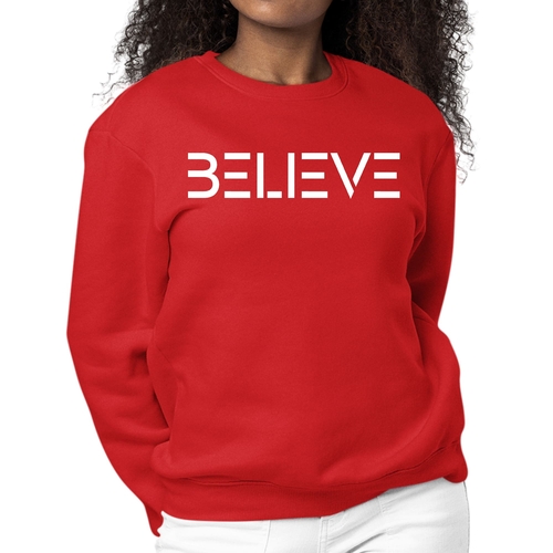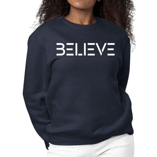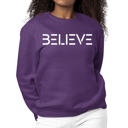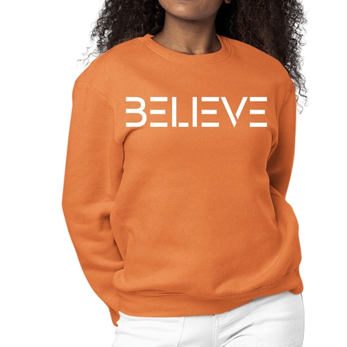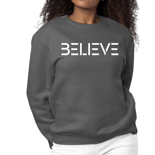Introducing our Women's Graphic Sweatshirt featuring an inspiring 'Believe' print, designed to motivate and uplift your spirit. This long sleeve crewneck sweatshirt is not only stylish but also incredibly comfortable, making it the perfect addition to your wardrobe for any occasion. Whether you're lounging at home, running errands, or meeting friends, this sweatshirt will keep you cozy and fashionable.