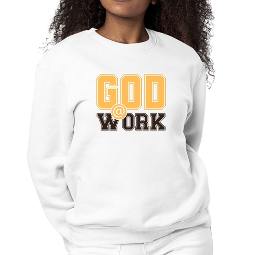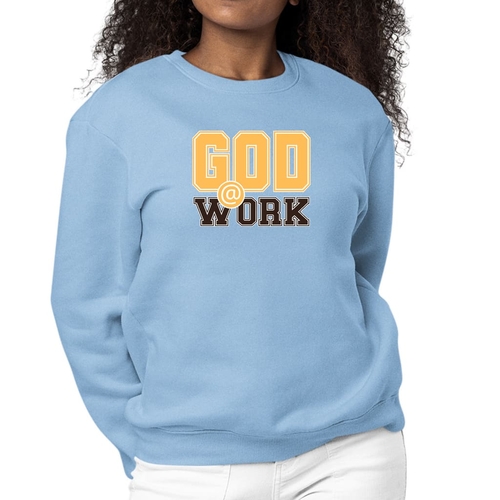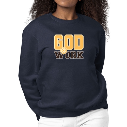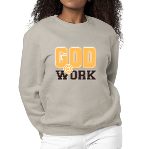 Introducing the Women's Graphic Sweatshirt featuring the inspiring phrase 'God @ Work' in a stunning golden yellow and brown print. This stylish crewneck sweatshirt is designed for comfort and durability, making it an ideal choice for everyday wear. Whether you're lounging at home, running errands, or meeting friends, this sweatshirt will keep you looking fashionable while expressing your faith.