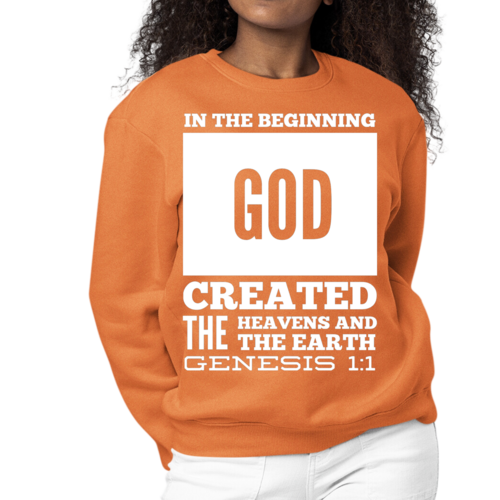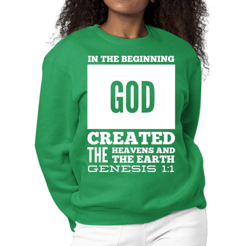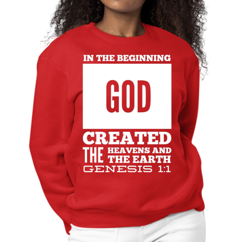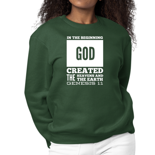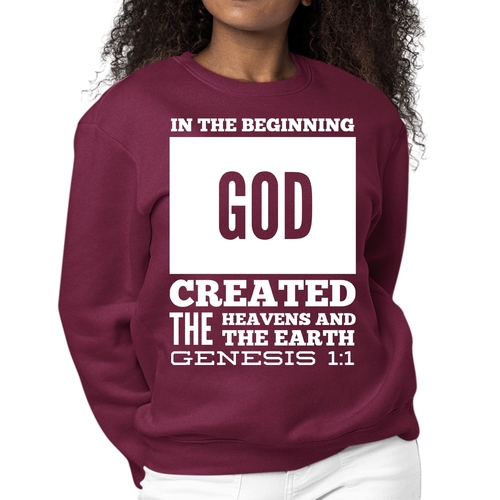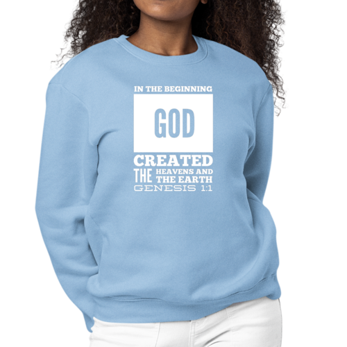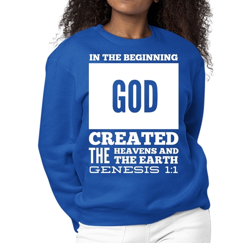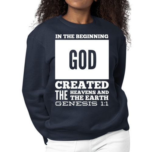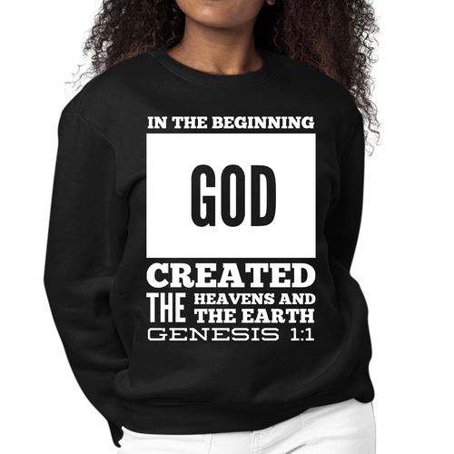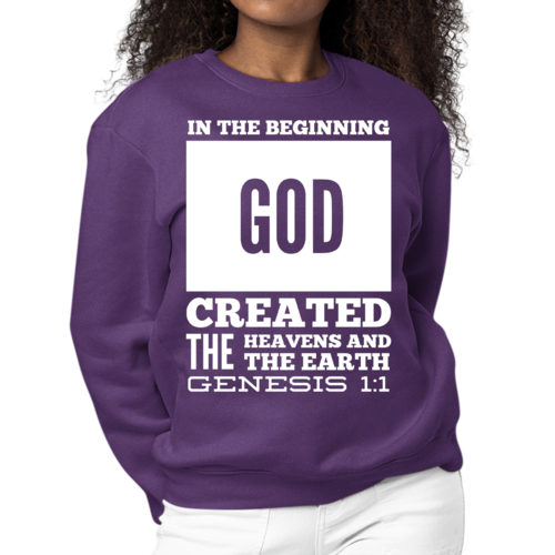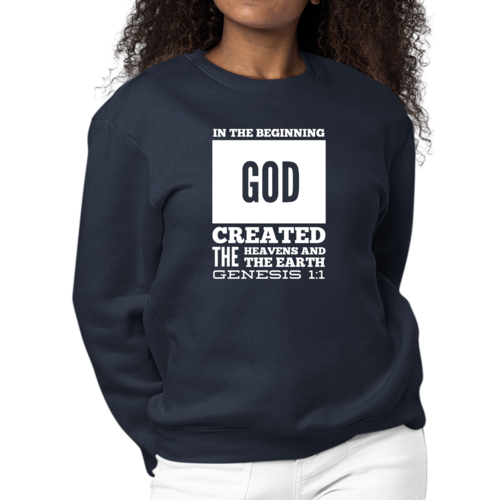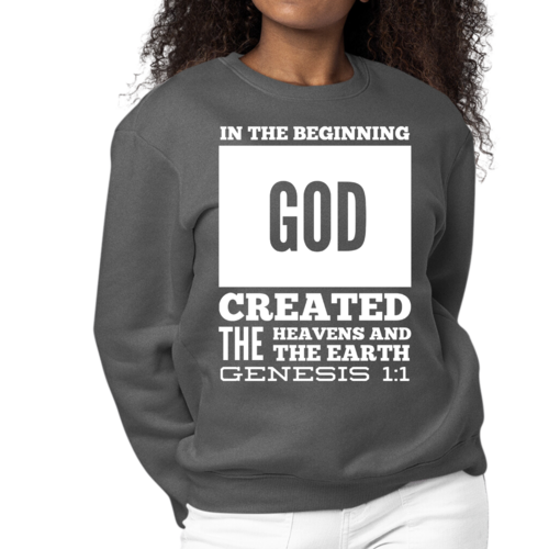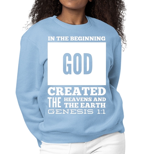 Introducing our Women's Graphic Sweatshirt in the Beginning Print, a stylish and comfortable addition to your wardrobe. This sweatshirt features the inspiring scripture verse, 'In The Beginning God Created The Heavens And The Earth,' making it not only a fashion statement but also a reminder of faith. Crafted with a durable 50/50 cotton and polyester blend, this sweatshirt is designed to withstand daily wear while providing ultimate comfort.