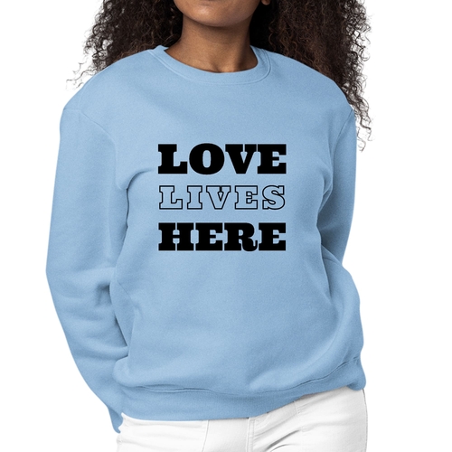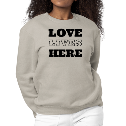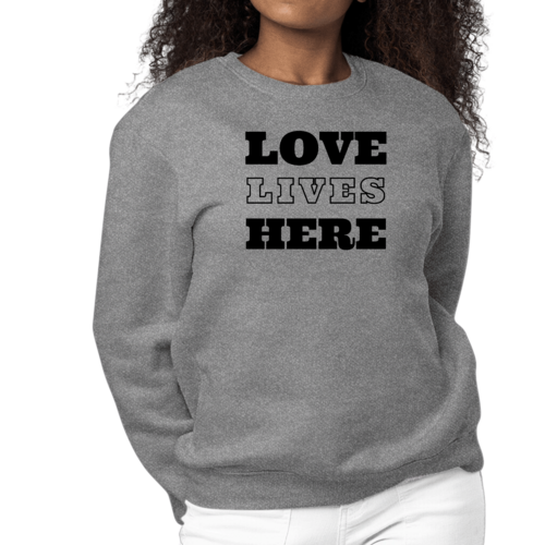 Womens Graphic Sweatshirt featuring 'Love Lives Here' design, cozy fleece fabric, and classic crewneck style in various colors.