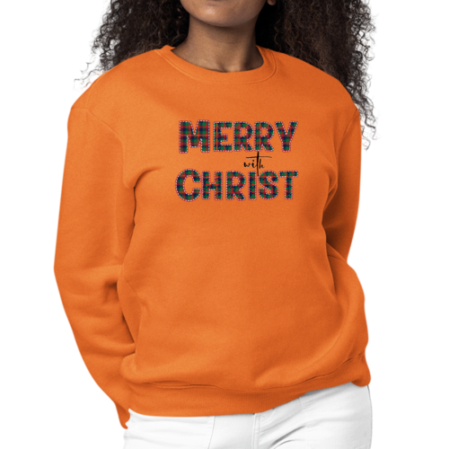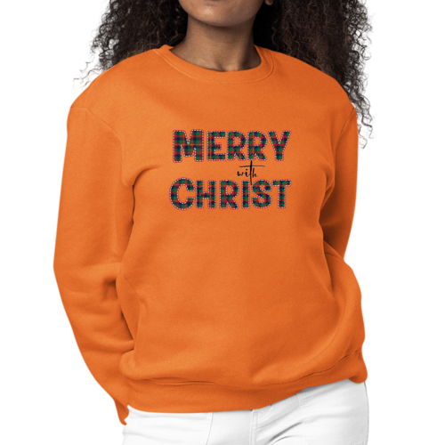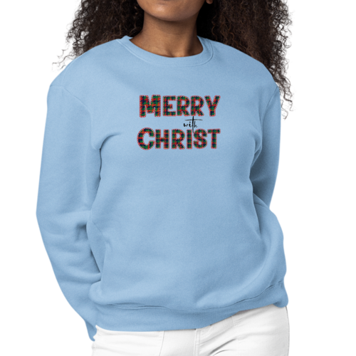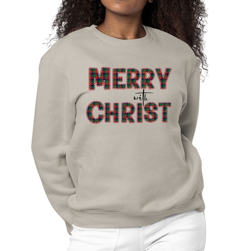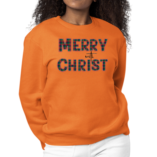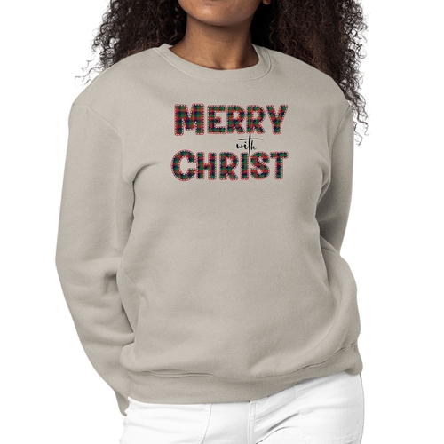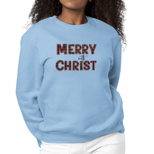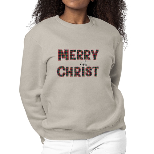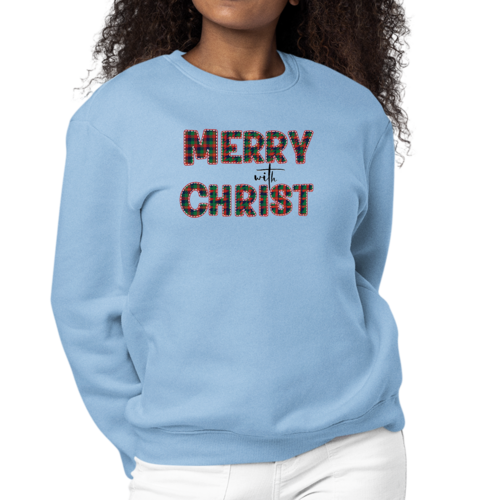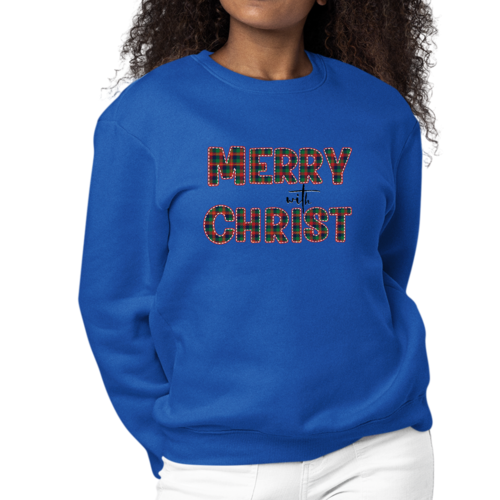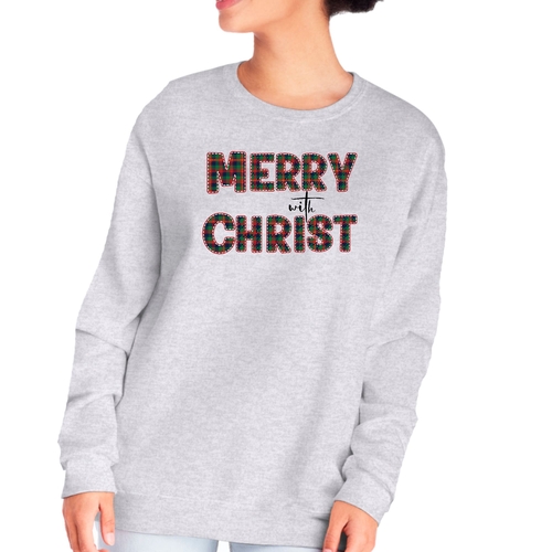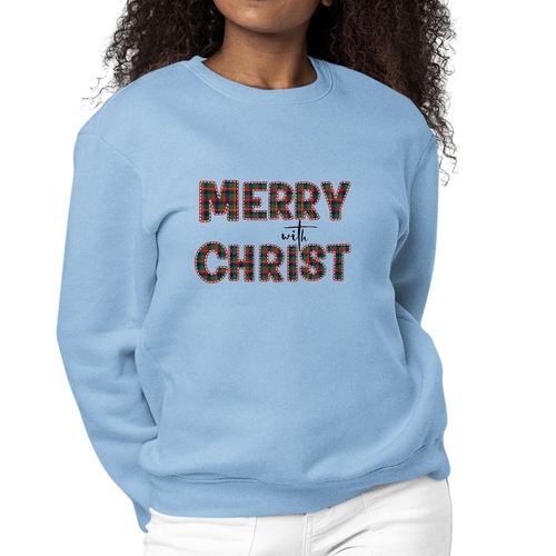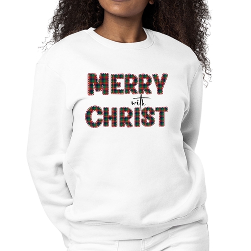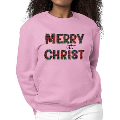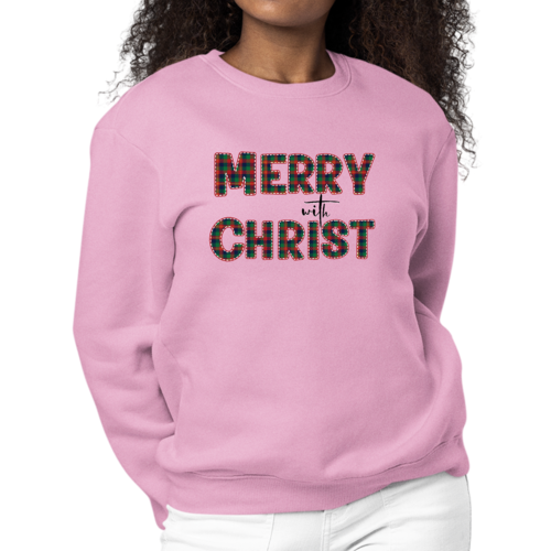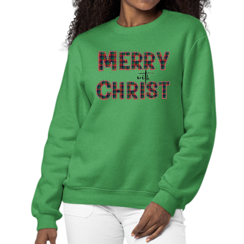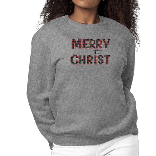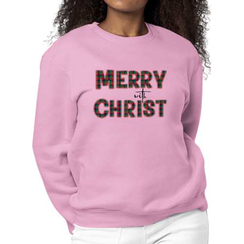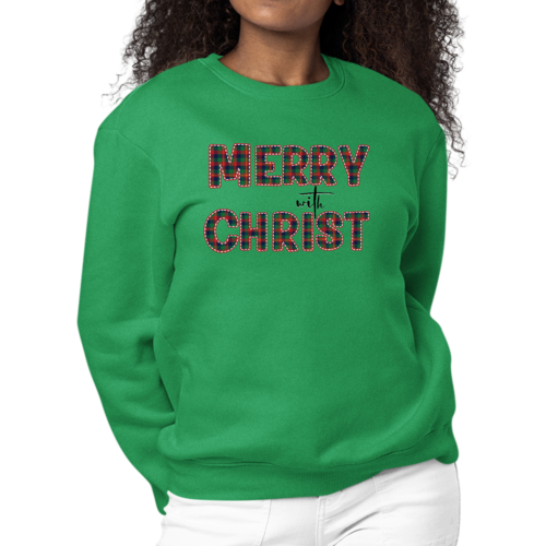 Introducing our Women's Graphic Sweatshirt featuring a charming Merry with Christ design, perfect for the holiday season. This sweatshirt combines style and comfort, making it an essential addition to your winter wardrobe. The vibrant red and green plaid pattern adds a festive touch, allowing you to celebrate the season in style.