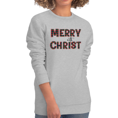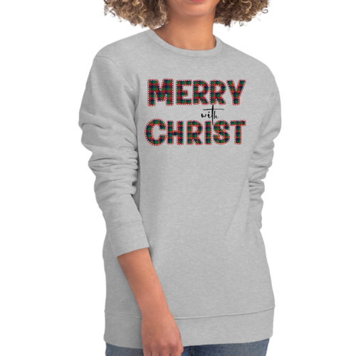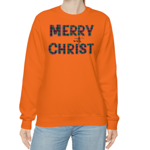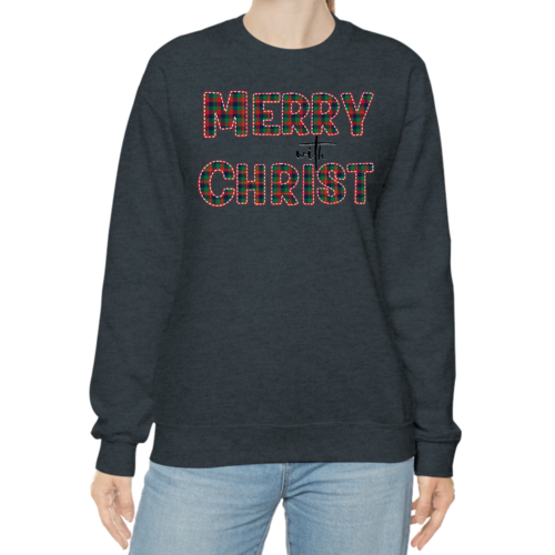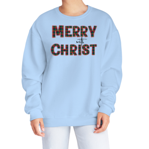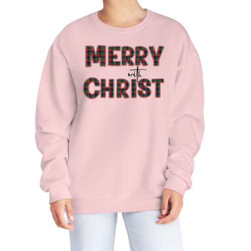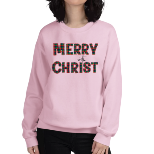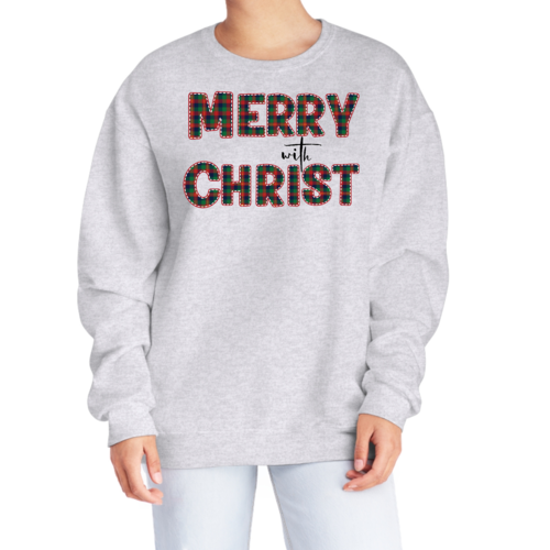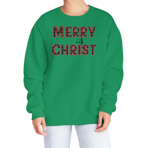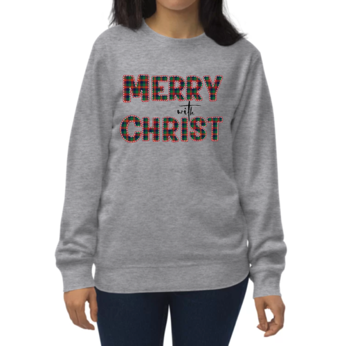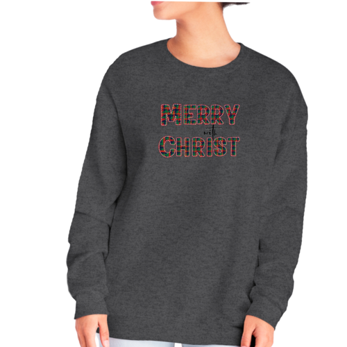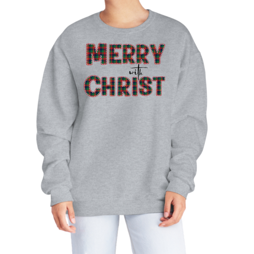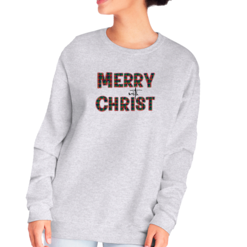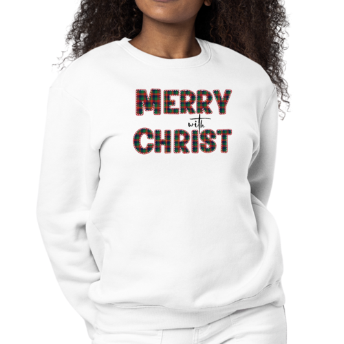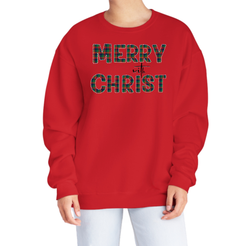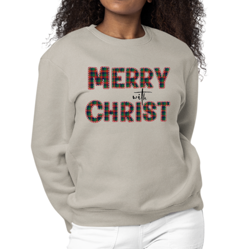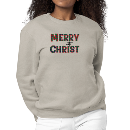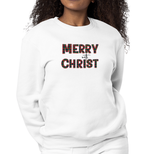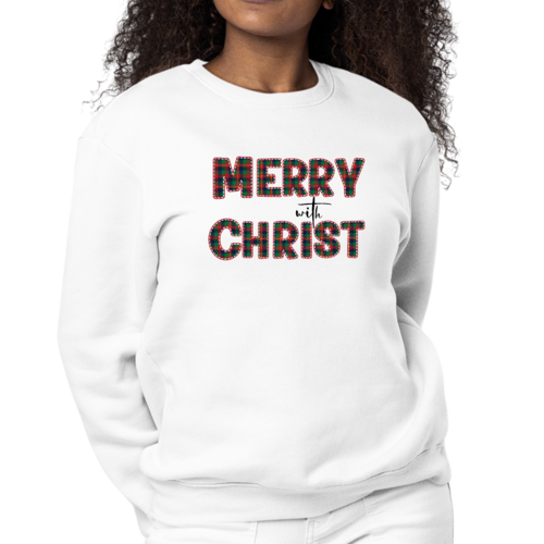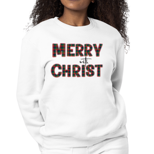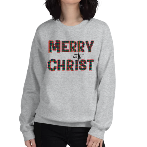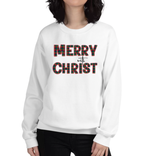 In summary, our Women's Graphic Sweatshirt featuring the Merry with Christ design in red and green plaid is a must-have for anyone looking to celebrate the holiday season in style. With its comfortable fabric, unisex fit, and durable construction, this sweatshirt is sure to become a favorite in your wardrobe. Don't miss out on the chance to spread holiday cheer with this festive piece!