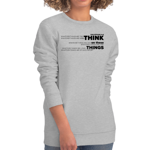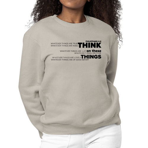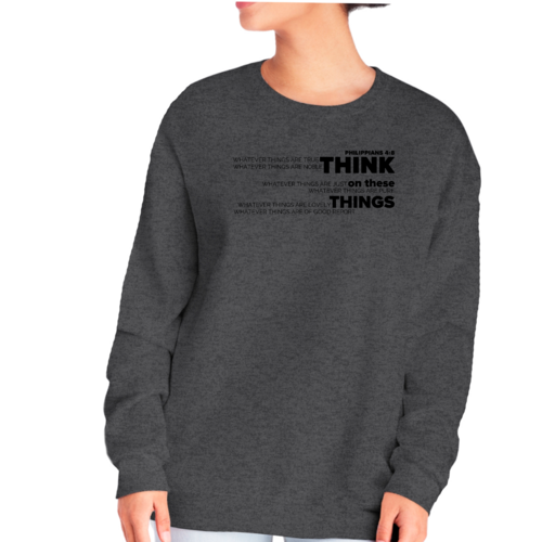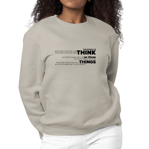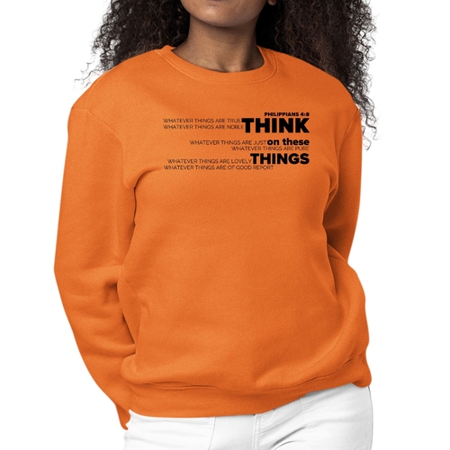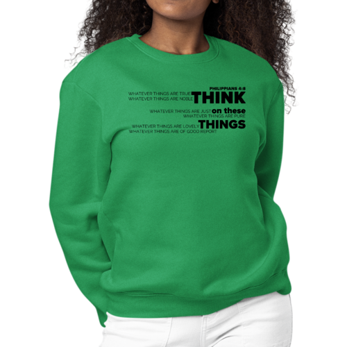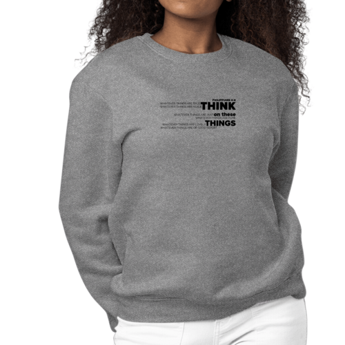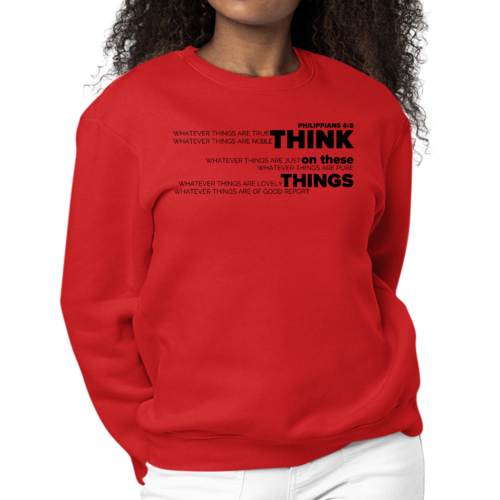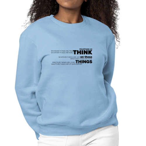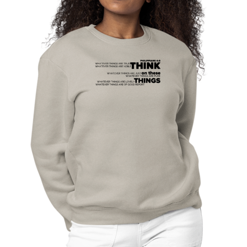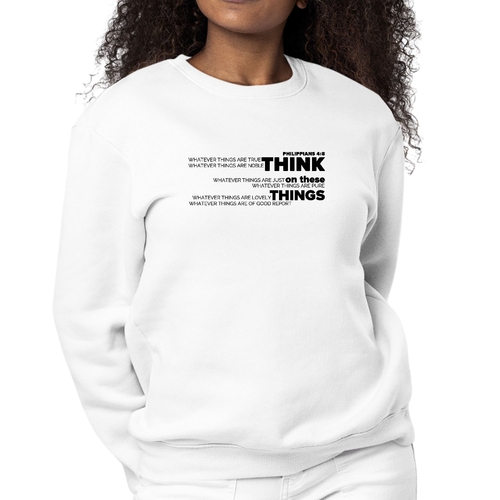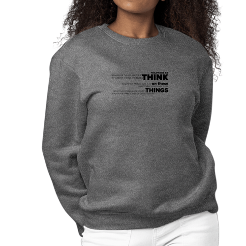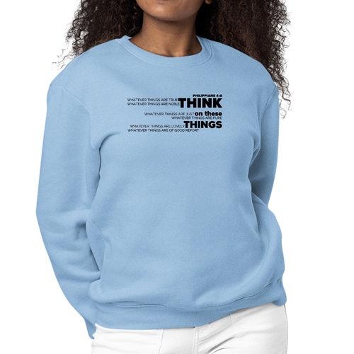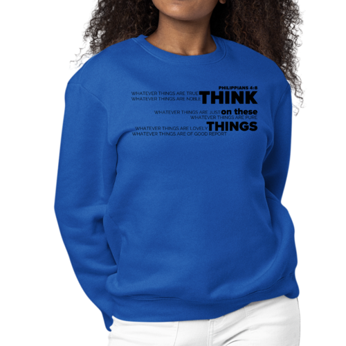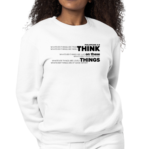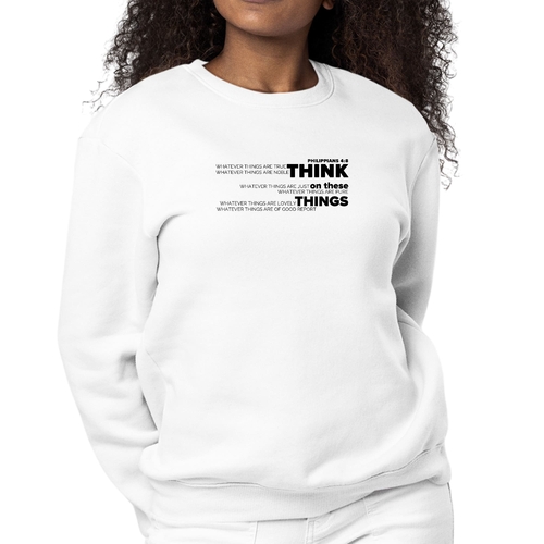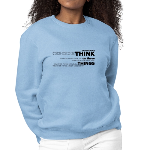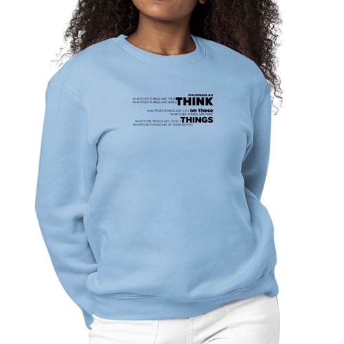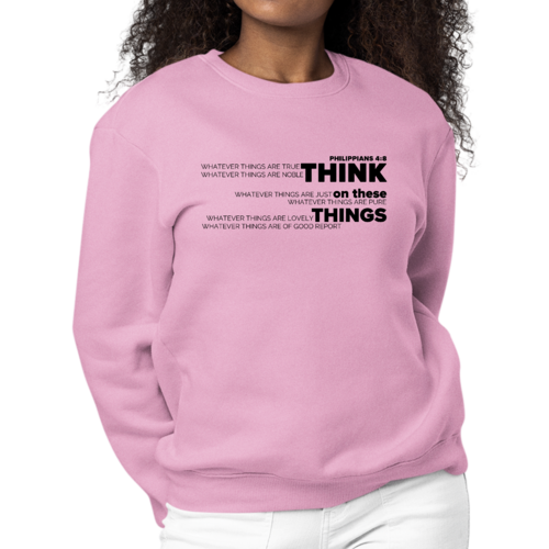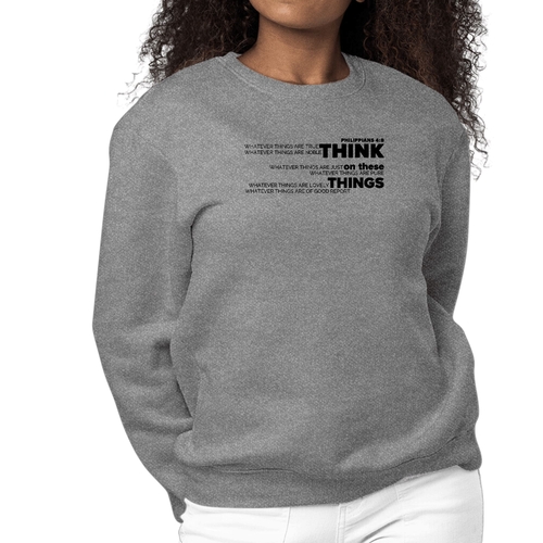 Introducing our Women's Graphic Sweatshirt, a perfect blend of comfort and style, featuring the inspiring scripture quote 'Think On These Things' in a striking black illustration. This sweatshirt is designed for women who appreciate both fashion and faith, making it an ideal addition to any wardrobe. Crafted from a durable 50/50 cotton and polyester blend, this sweatshirt is not only soft to the touch but also built to last, ensuring you can wear it comfortably all day long.