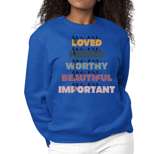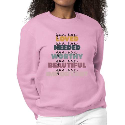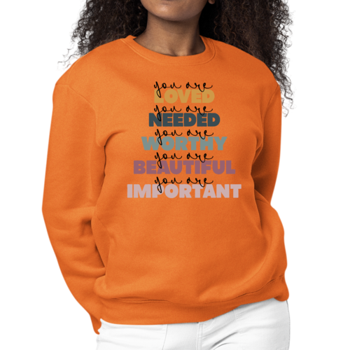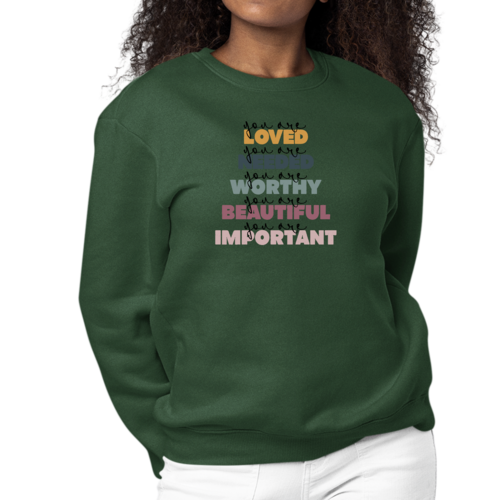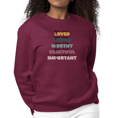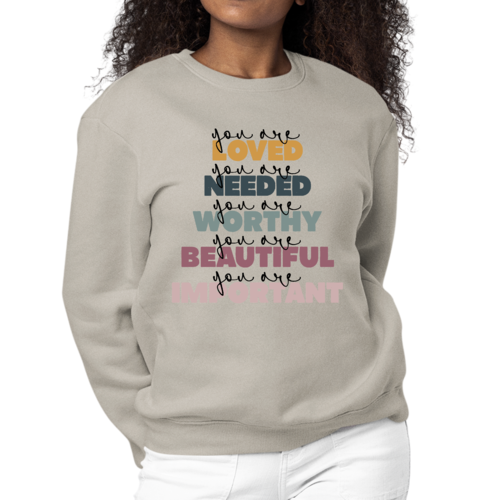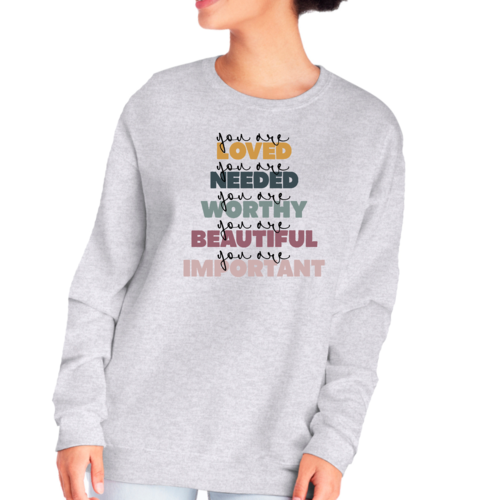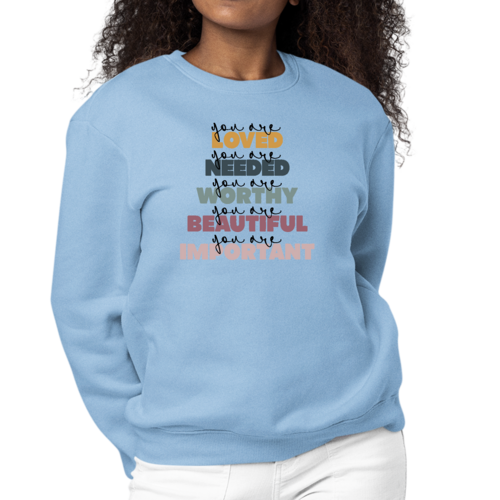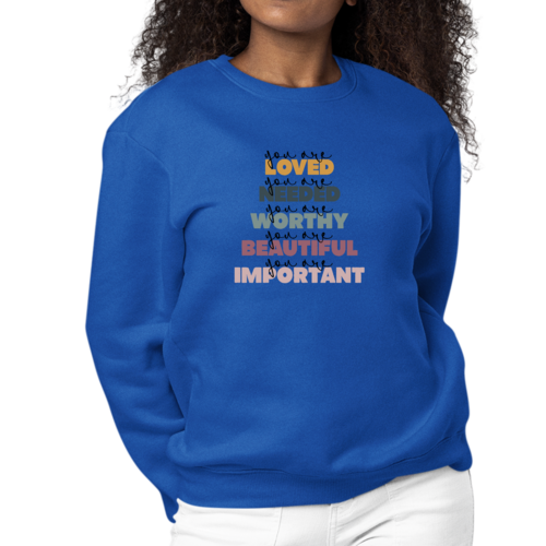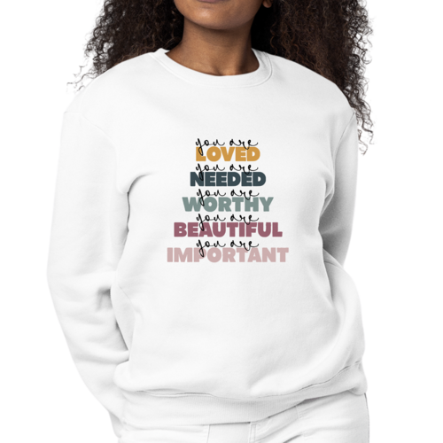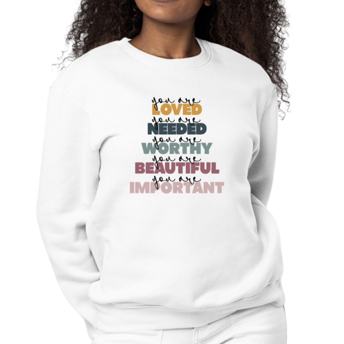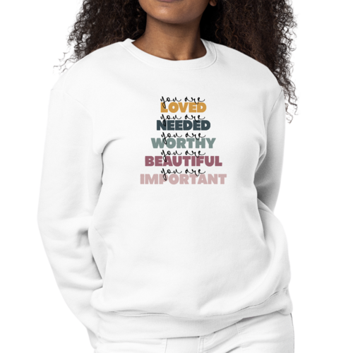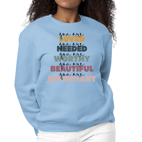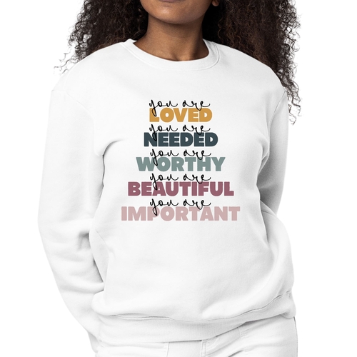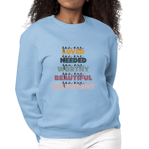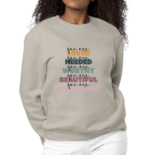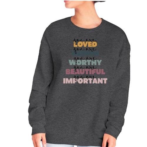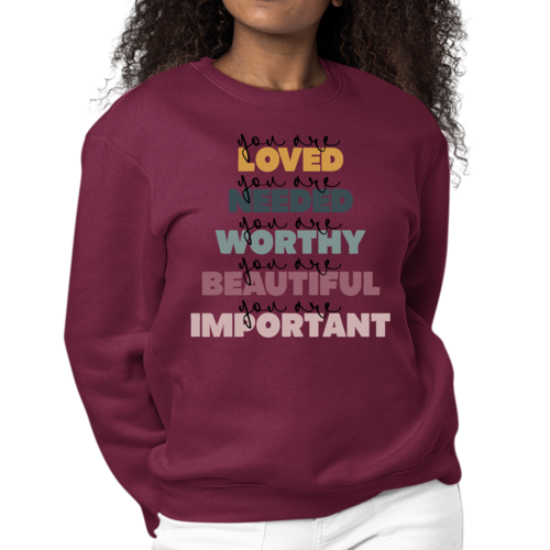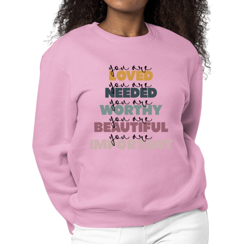 In summary, our Women's Graphic Sweatshirt featuring the 'You are Loved' affirmation is a must-have for anyone looking to combine comfort with a meaningful message. With its durable construction, stylish design, and easy care instructions, this sweatshirt is perfect for everyday wear. Embrace the warmth and inspiration it brings to your life!