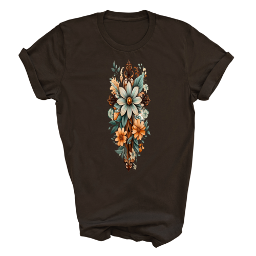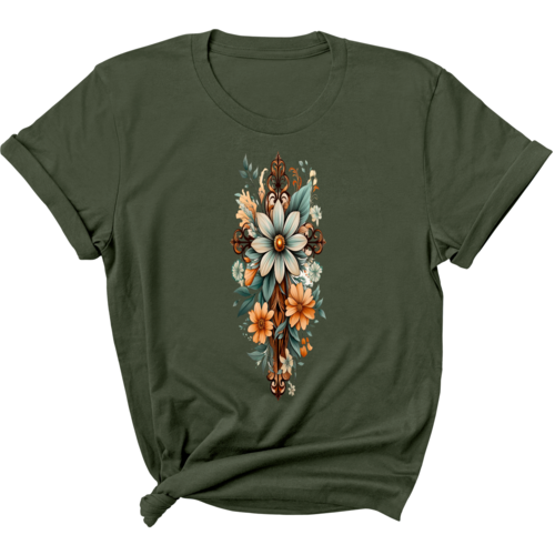 In summary, our Women's Graphic T-shirt featuring a Christian Cross Floral Bouquet in green and brown is a must-have for anyone looking to combine comfort, style, and faith. With its durable material, classic fit, and easy care instructions, this T-shirt is designed to be a staple in your wardrobe for years to come.
