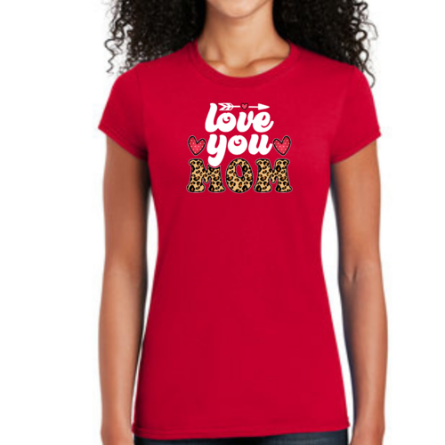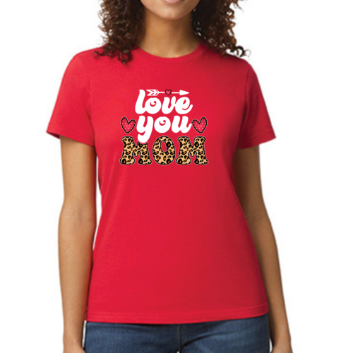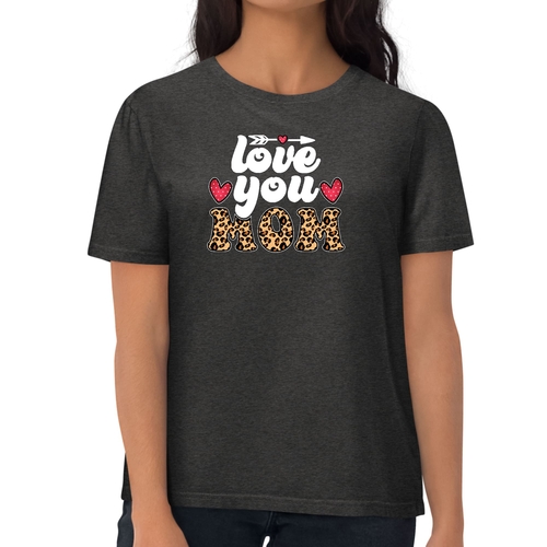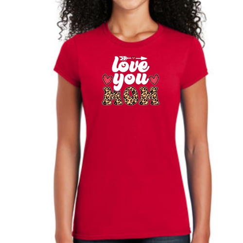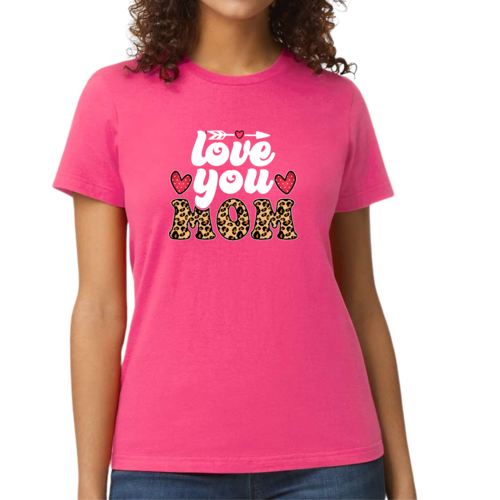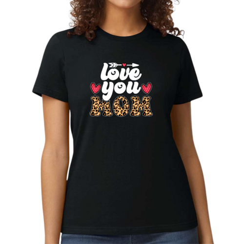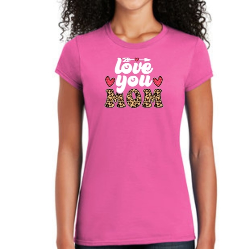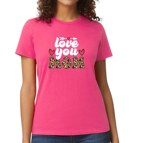 Women's Graphic T-shirt featuring 'Love You Mom' leopard print design, made from soft preshrunk cotton.