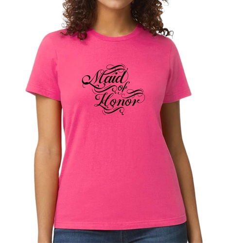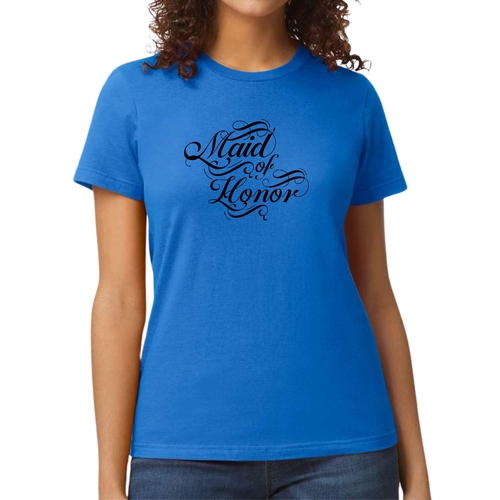 Introducing our Women's Graphic T-shirt Maid of Honor, a perfect addition to any bridal party wardrobe. This stylish and comfortable tee is designed specifically for those who play a special role in a wedding, making it an ideal choice for bridesmaids, maid of honor, and wedding guests alike. Made from high-quality cotton, this t-shirt offers a soft touch against the skin, ensuring you feel great while celebrating your loved ones.