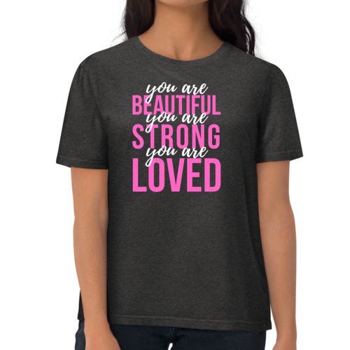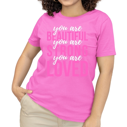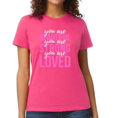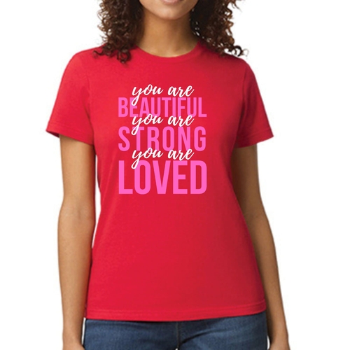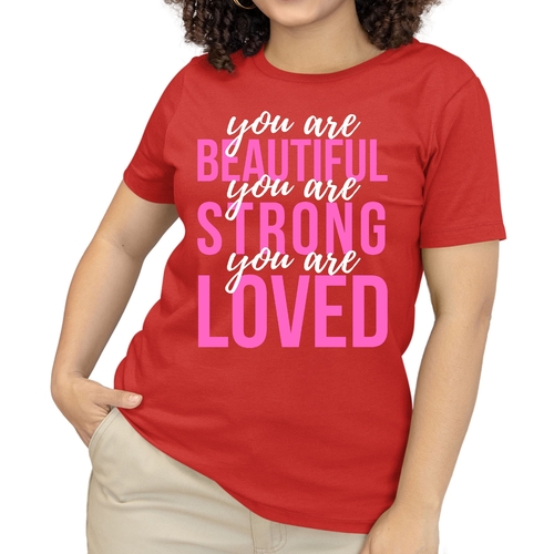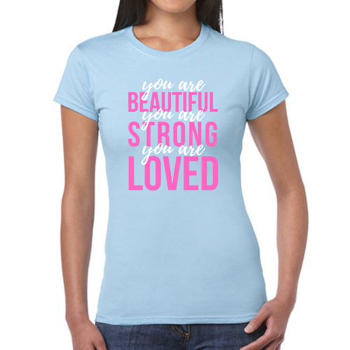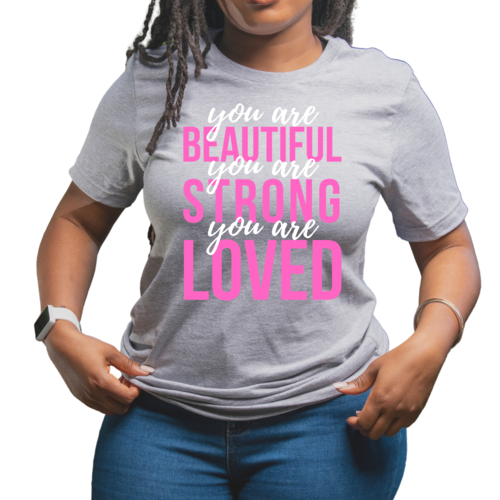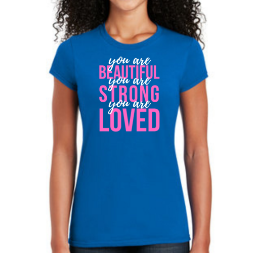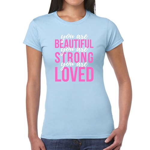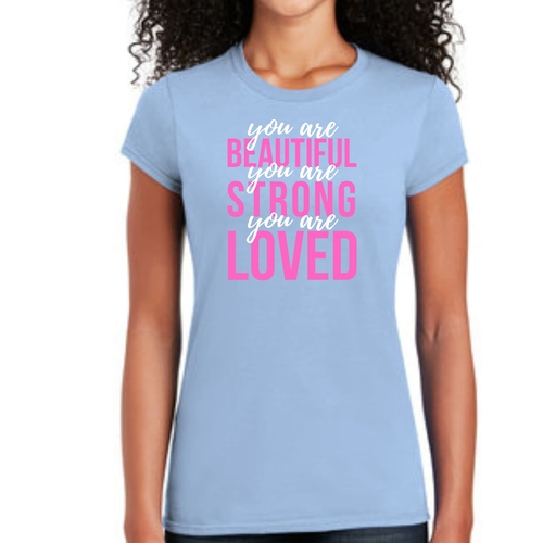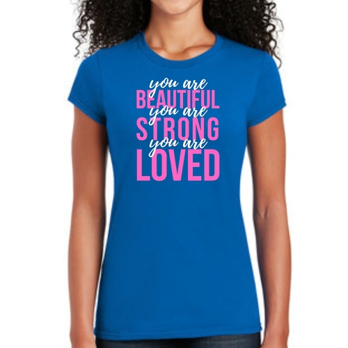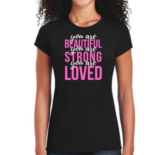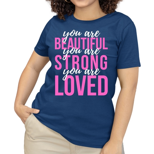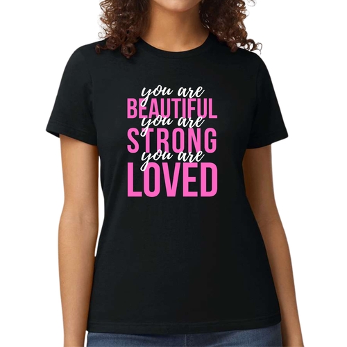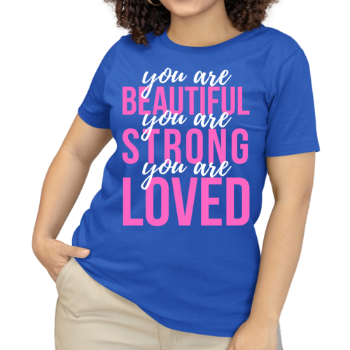 In summary, our Women's Graphic T-shirt with the 'You Are Beautiful Strong Loved' affirmation is a must-have for anyone looking to add a touch of inspiration to their wardrobe. With its comfortable fit, high-quality materials, and motivational message, this T-shirt is sure to become a favorite in your collection.