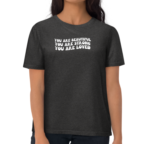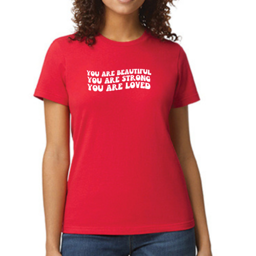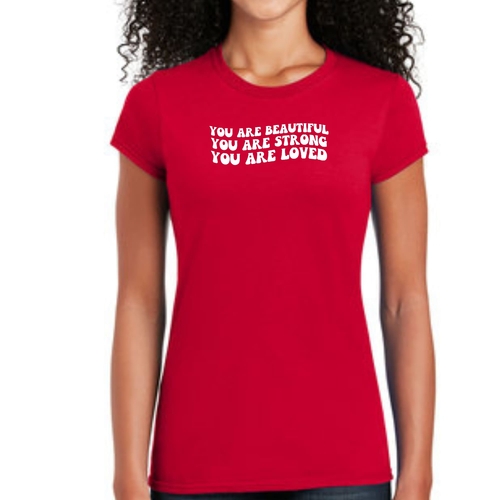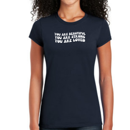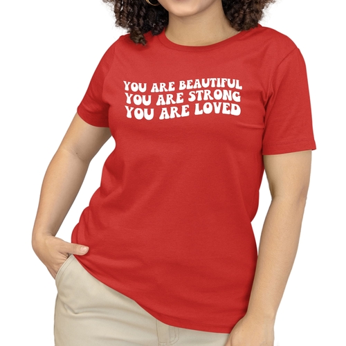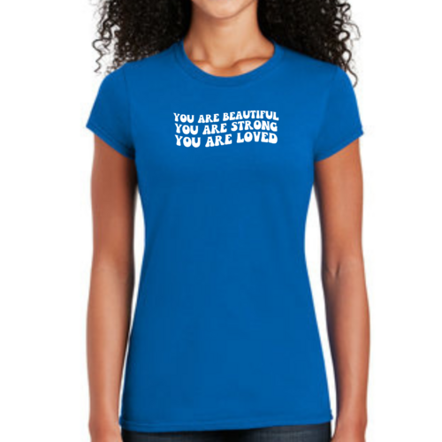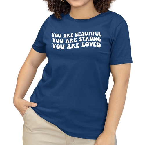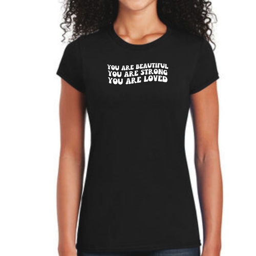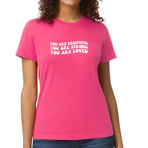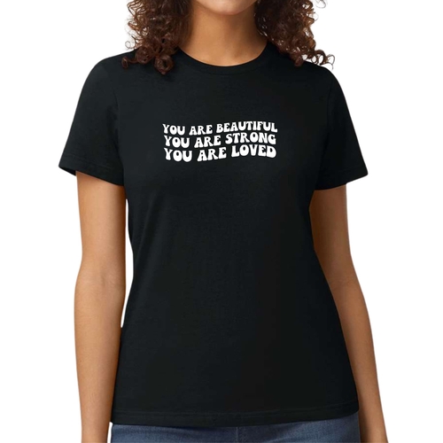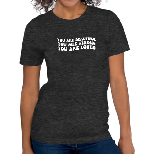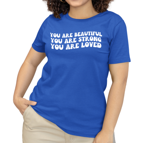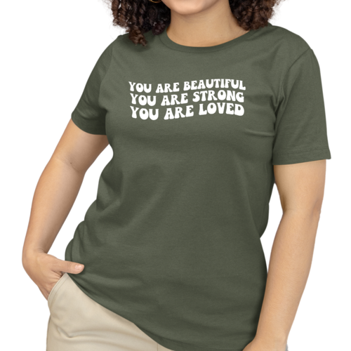 This T-shirt is more than just a piece of clothing; it carries a powerful message of self-love and empowerment. The affirmation 'You Are Beautiful Strong Loved' serves as a daily reminder to embrace your worth and strength. Wearing this T-shirt not only boosts your confidence but also inspires those around you to recognize their own beauty and strength.