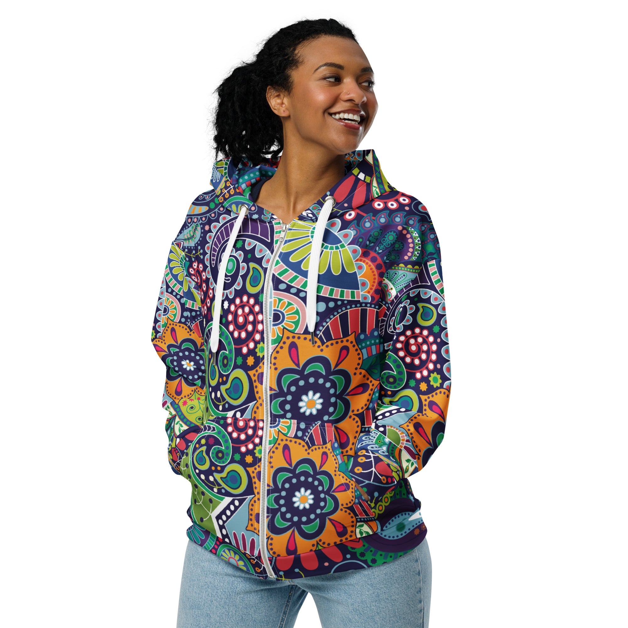 In summary, the Womens Graphic Zip Hoodie Floral Paisley 22523 is a must-have for anyone looking to combine comfort, style, and sustainability. With its unique design, high-quality materials, and thoughtful features, this hoodie is sure to become a favorite in your wardrobe.