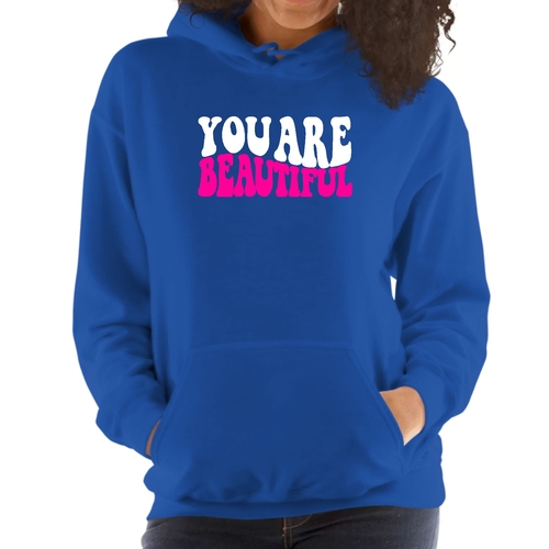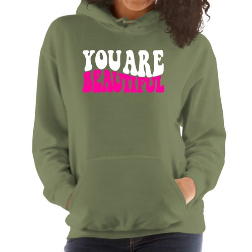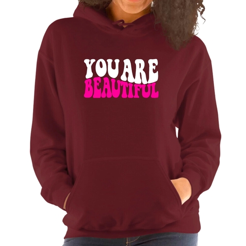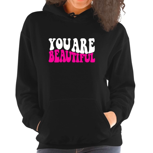 Introducing the stunning Womens Hoodie featuring the uplifting message 'You Are Beautiful' in a retro wavy pink and white design. This hoodie is not just a piece of clothing; it's a statement of positivity and self-love. Made from a premium blend of 50% cotton and 50% polyester, it offers the perfect balance of comfort and durability, making it an essential addition to your wardrobe.