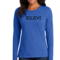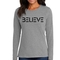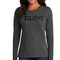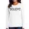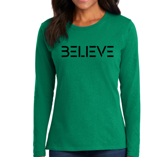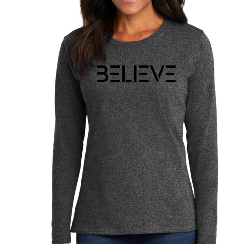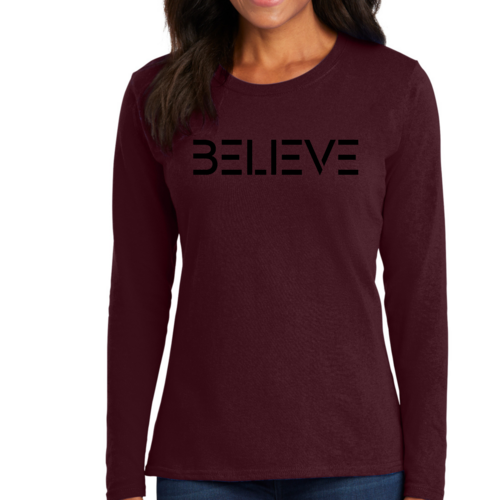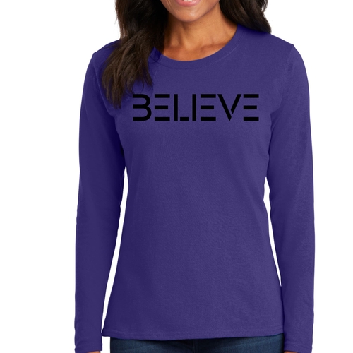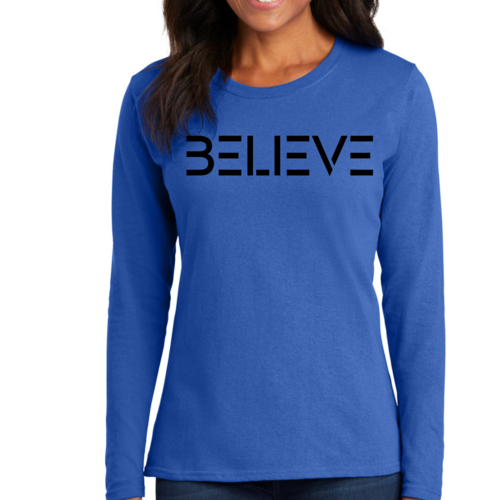 In summary, the Womens Long Sleeve Graphic T-shirt with the 'Believe' black print is a must-have for anyone looking to combine comfort, style, and inspiration in their wardrobe. With its high-quality materials, thoughtful design, and motivational message, this t-shirt is sure to become a favorite in your collection.