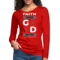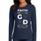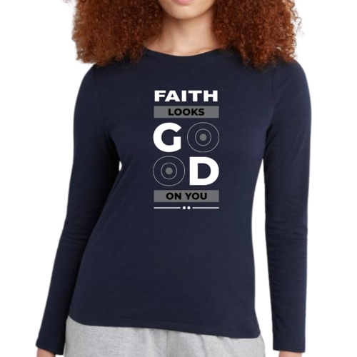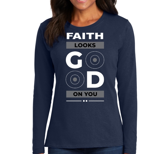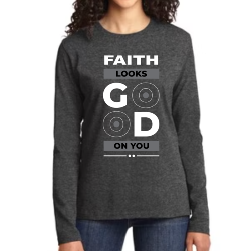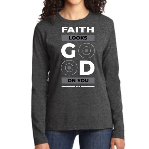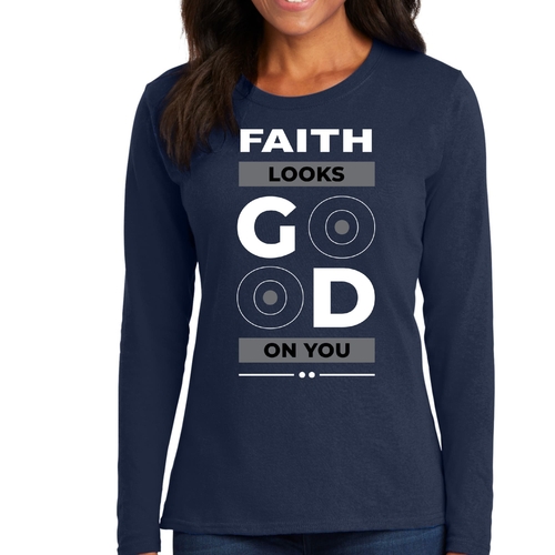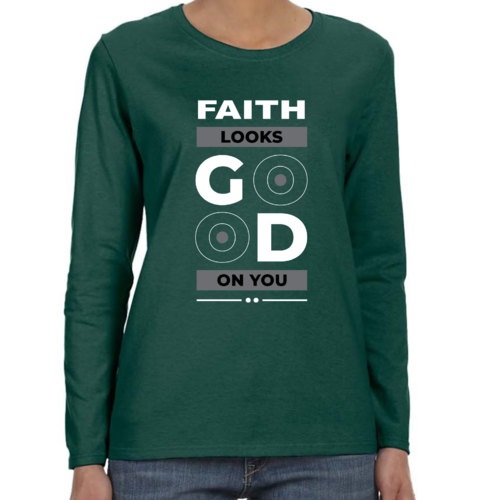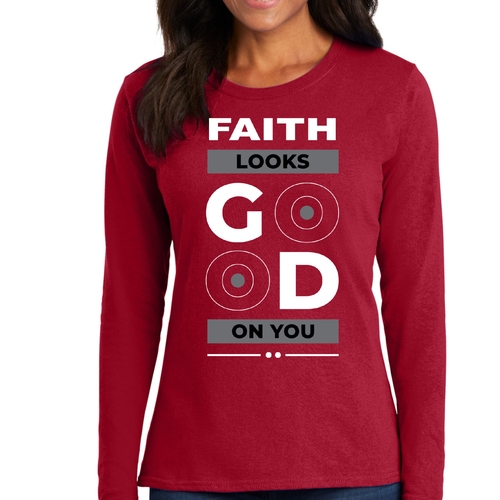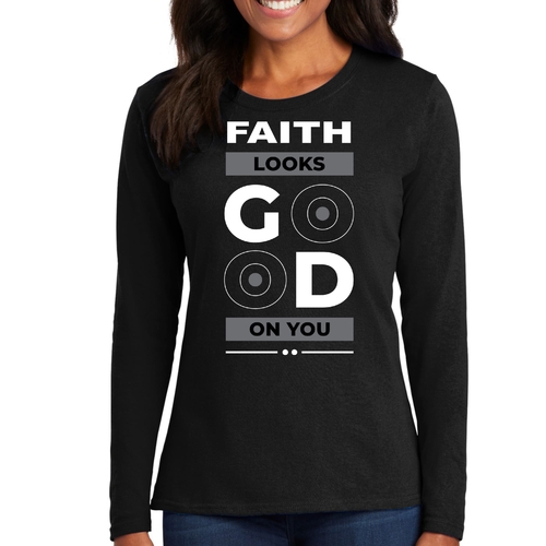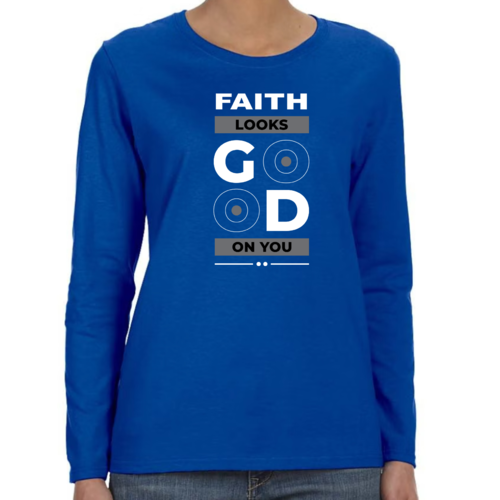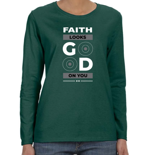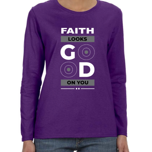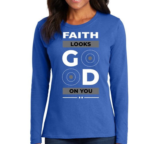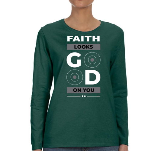 In summary, the Women's Long Sleeve Graphic T-shirt, Faith Looks Good, is a perfect addition to any woman's wardrobe. With its soft cotton material, durable construction, stylish design, and versatility, it is a must-own item that you will reach for time and time again. Don't miss out on the opportunity to express your faith and style with this beautiful t-shirt.