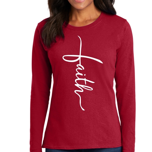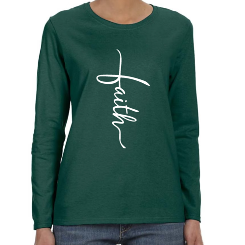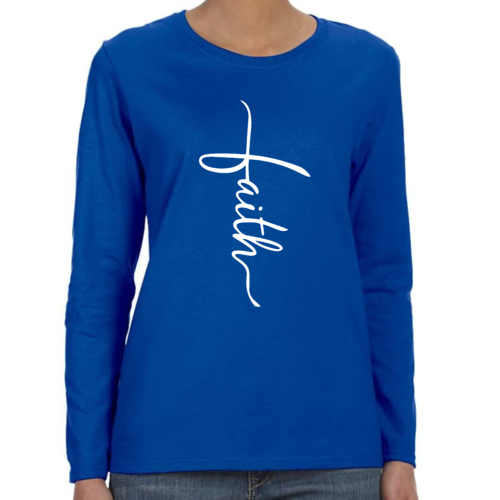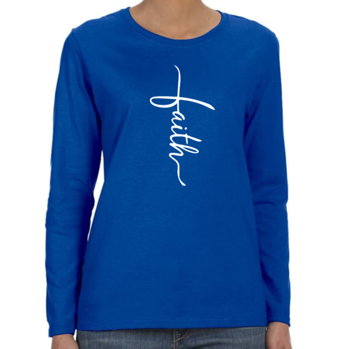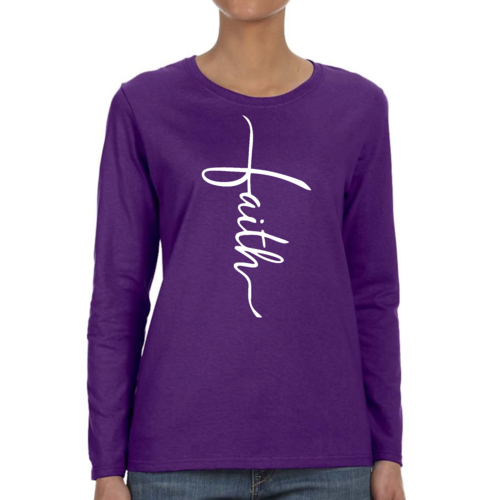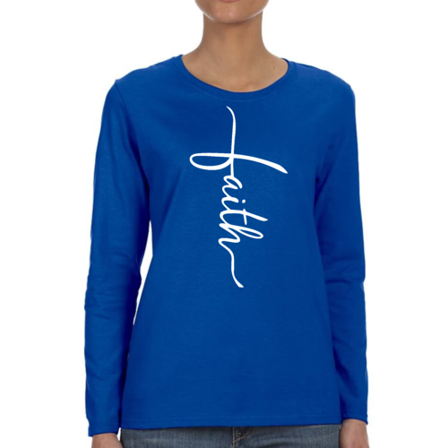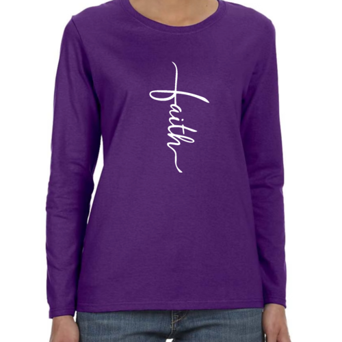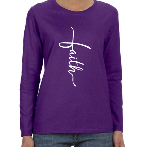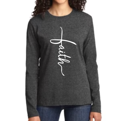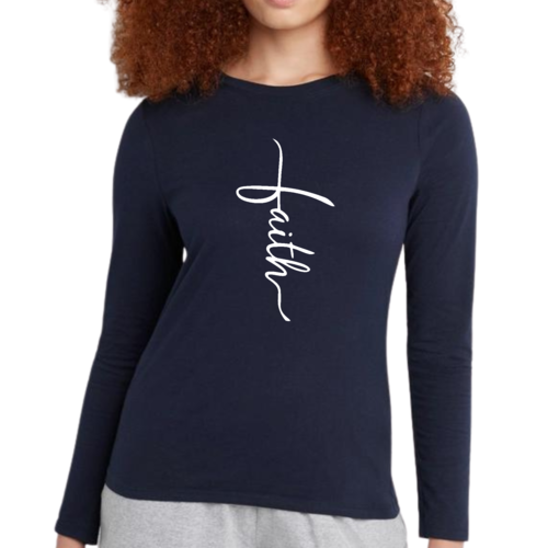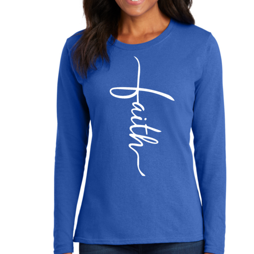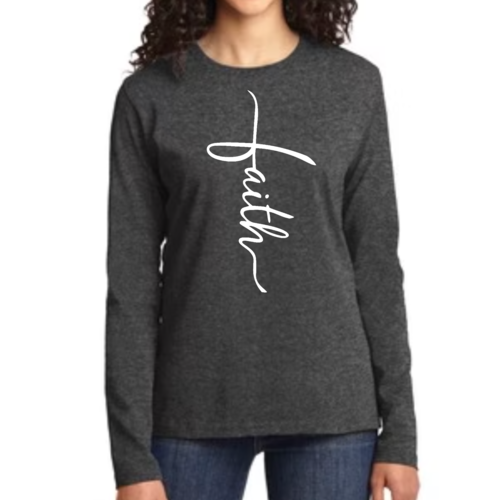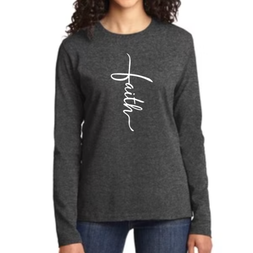 Introducing our Women's Long Sleeve Graphic T-shirt, featuring a beautiful Faith Script Cross Illustration. This premium long sleeve t-shirt is designed for those who value both comfort and style. Made from high-quality cotton, it offers a soft touch against the skin, making it perfect for all-day wear. Whether you're attending a casual gathering, a church service, or simply lounging at home, this t-shirt is a versatile addition to your wardrobe.