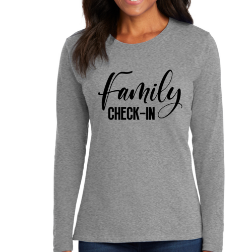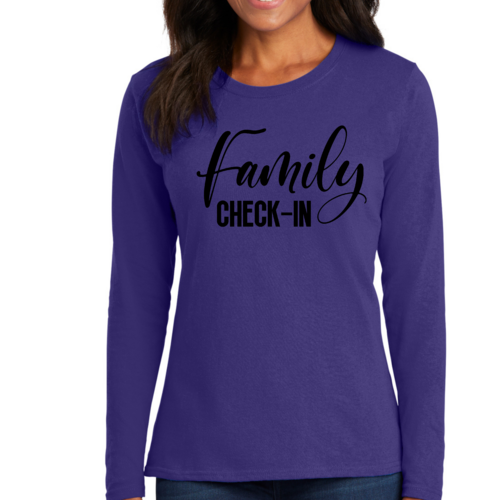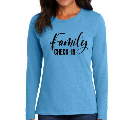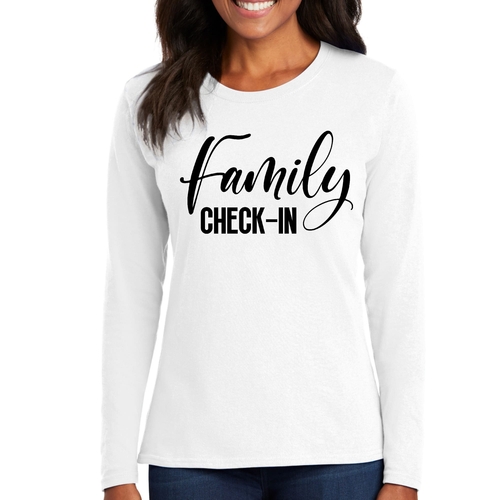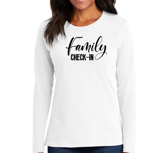 In summary, our Womens Long Sleeve Graphic T-shirt with Family Check-in illustration is the perfect blend of style, comfort, and quality. Ideal for family gatherings, this tee will keep you looking great while celebrating the bonds that matter most.