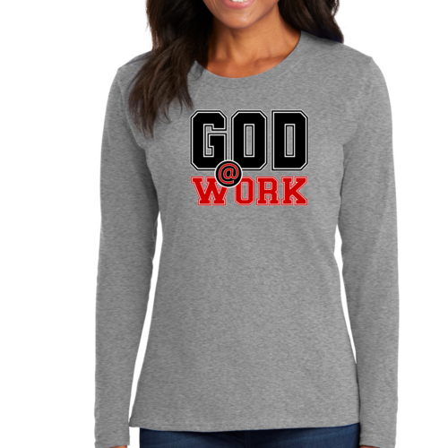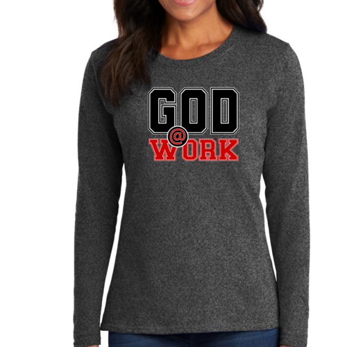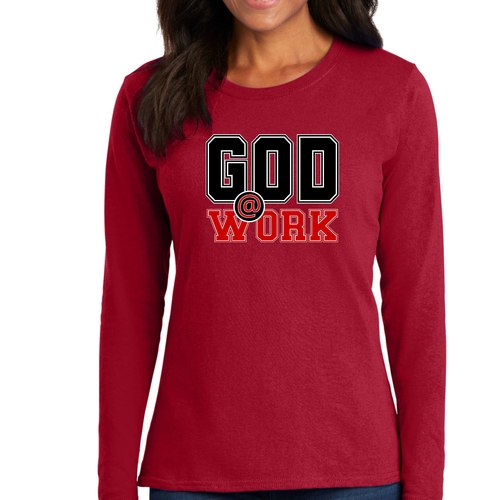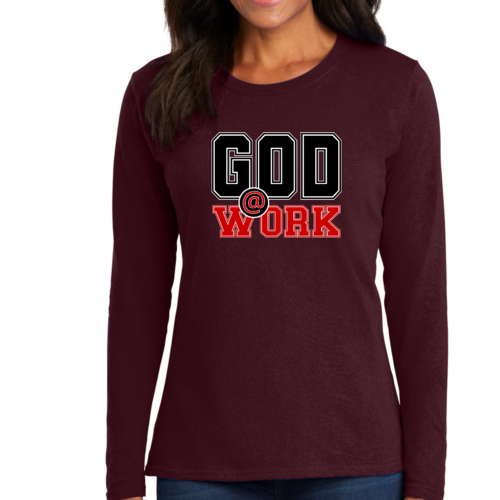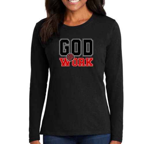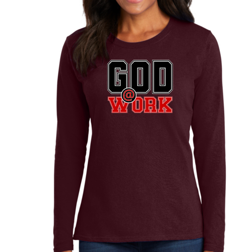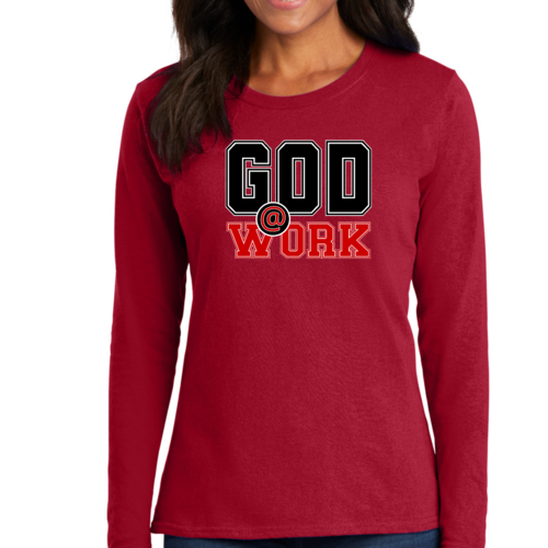 Introducing our Womens Long Sleeve Graphic T-shirt, featuring the eye-catching God @ Work print in bold black and red. This t-shirt is not just a piece of clothing; it's a statement of faith and style. Crafted from high-quality, breathable cotton, this long sleeve tee is designed to provide comfort and versatility throughout the year. Whether you're layering it for warmth in the winter or wearing it solo in the spring, this shirt is your go-to choice for any occasion.