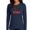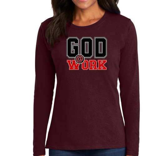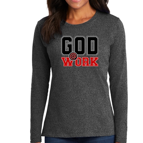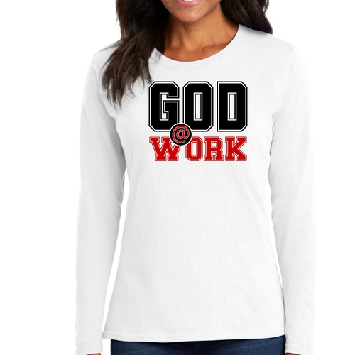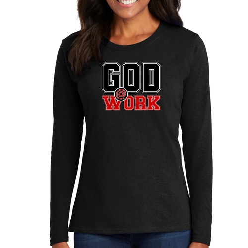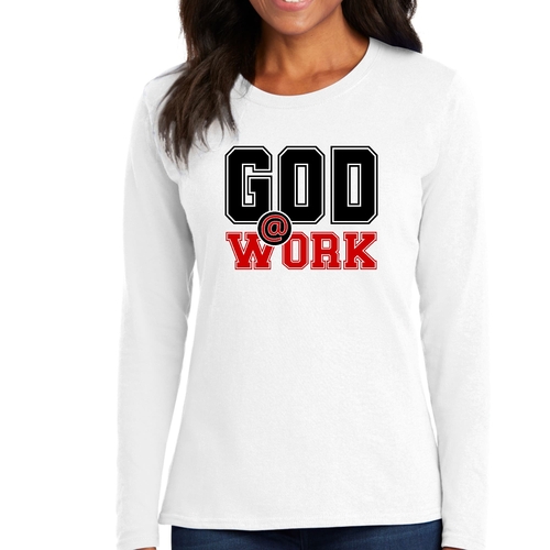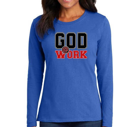 In summary, our Womens Long Sleeve Graphic T-shirt with the God @ Work print is a stylish and comfortable addition to any wardrobe. Its versatility makes it suitable for various occasions, while the quality materials ensure that it will last for years to come. Embrace your faith and express your style with this unique graphic tee!