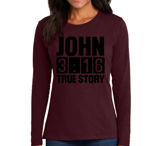In summary, our Womens Long Sleeve Graphic T-shirt featuring the John 3:16 True Story print is a must-have for anyone who values comfort, quality, and inspiration. With its soft preshrunk cotton fabric, classic fit, and meaningful design, this t-shirt is perfect for everyday wear or special occasions. Shop now and add this beautiful piece to your collection!