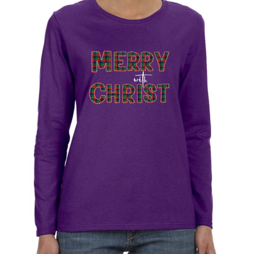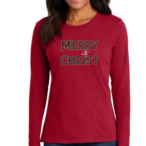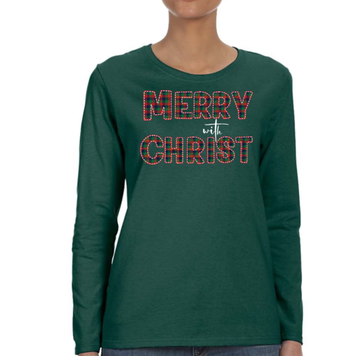 Introducing our Women's Long Sleeve Graphic T-shirt, a perfect blend of style and comfort for the holiday season. This t-shirt features a vibrant 'Merry with Christ' design in eye-catching red and green colors, making it an ideal choice for festive gatherings and celebrations. Crafted from high-quality cotton, this shirt ensures a soft and comfortable fit, allowing you to enjoy your holiday activities without any discomfort.