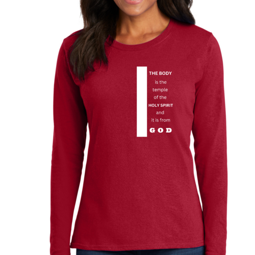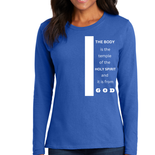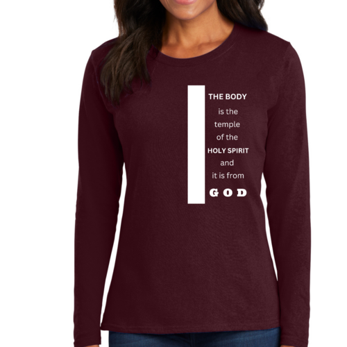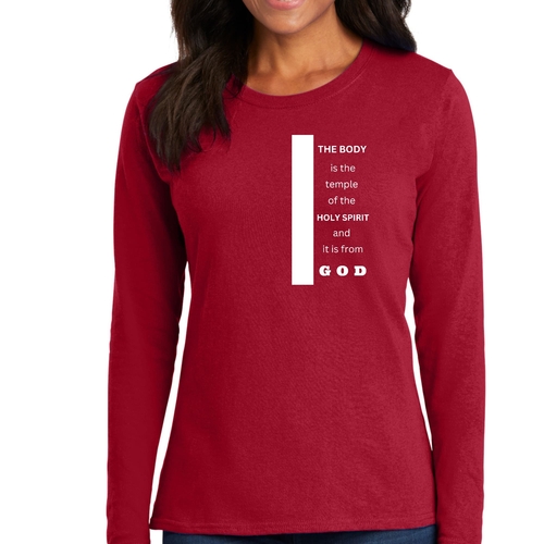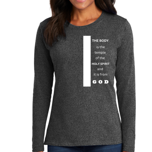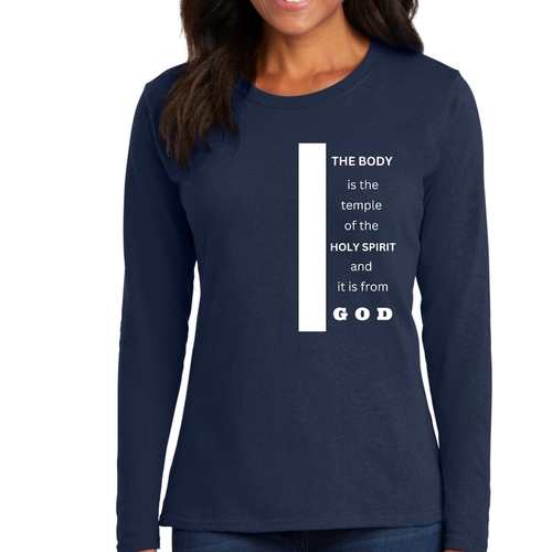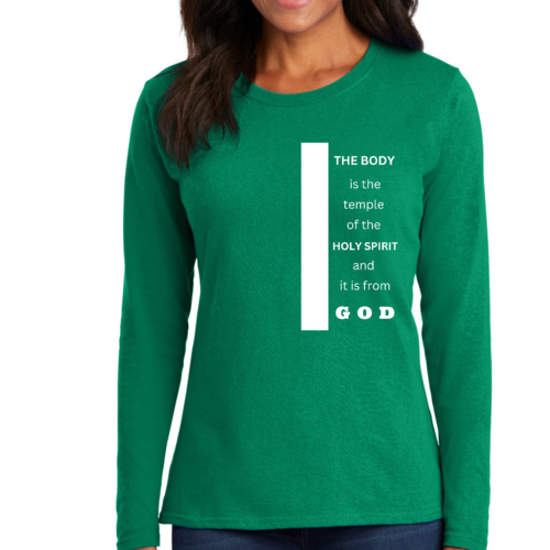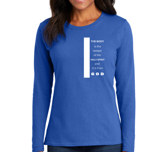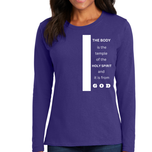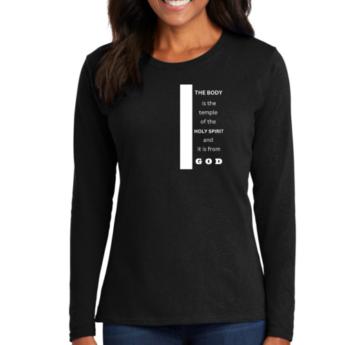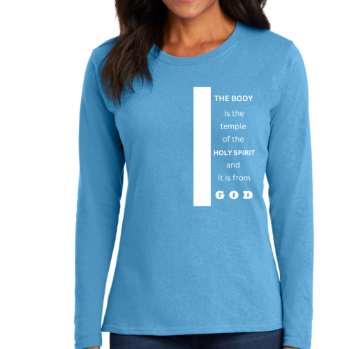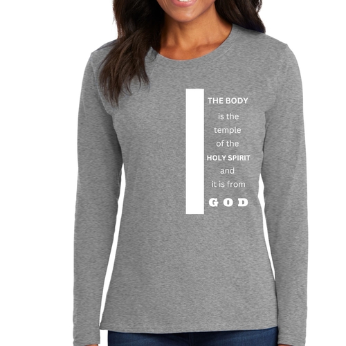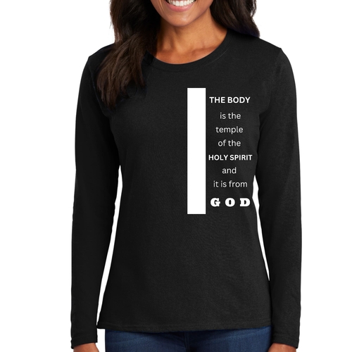 Introducing our Women's Long Sleeve Graphic T-shirt, featuring the inspiring phrase 'The Body is the Temple of the Holy Spirit.' This stylish and comfortable tee is perfect for those who want to express their faith while enjoying a relaxed fit. Made from high-quality preshrunk cotton, this shirt retains its softness and size even after multiple washes, ensuring that it remains a staple in your wardrobe for years to come.