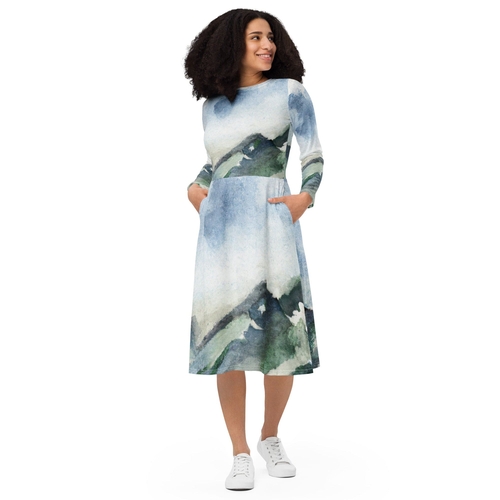 In summary, the Womens Long Sleeve Midi Dress featuring a Green Mountainside Nature Landscape print is a must-have for any fashion-forward woman. With its comfortable fabric, flattering design, functional pockets, and durable quality, this dress is sure to become your new favorite. Embrace your femininity and express your unique style with this stunning piece.