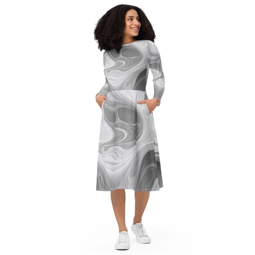 In summary, the Womens Long Sleeve Midi Dress in Grey White Boho Marble Print is a must-have for any fashion-forward woman. With its comfortable fabric, flattering design, practical pockets, and versatile style, it is sure to become a favorite in your wardrobe. Embrace your femininity and express your unique style with this stunning dress!