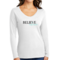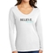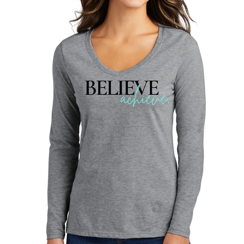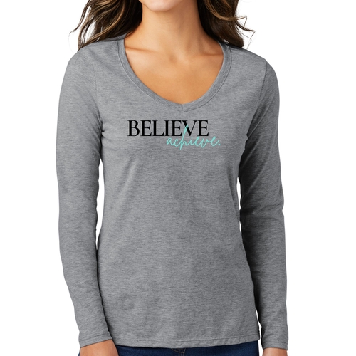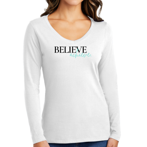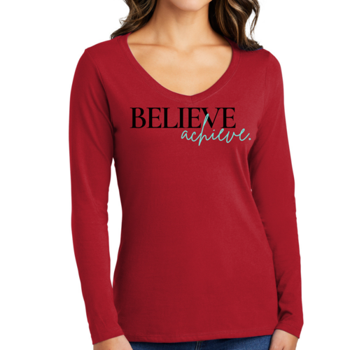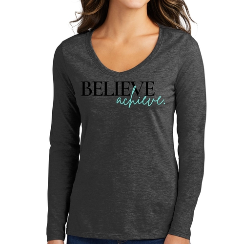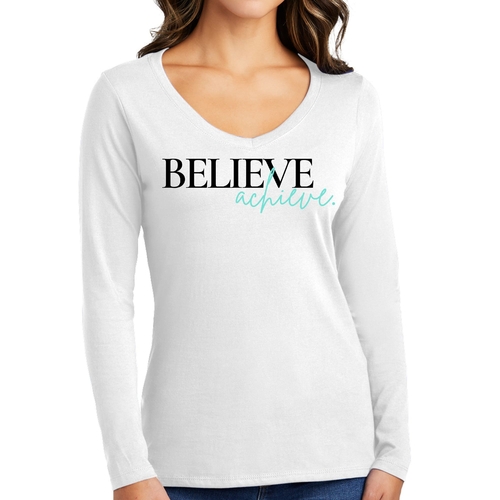 Introducing our Women's Long Sleeve V-neck Graphic T-shirt, designed with the empowering message 'Believe and Achieve'. This stylish tee is perfect for women who want to express their motivation and positivity through their clothing. Made from high-quality preshrunk cotton, this shirt ensures that you stay comfortable while looking fabulous.