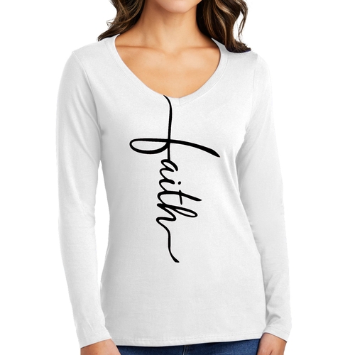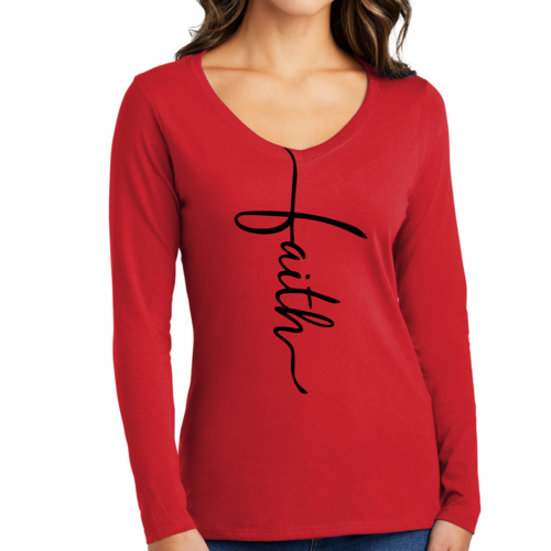 Introducing our Women's Long Sleeve V-neck Graphic T-shirt, a perfect blend of comfort and style that showcases your faith. This T-shirt features a beautiful Faith Script Cross design, making it an ideal choice for those who want to express their beliefs while staying fashionable. Made from soft, preshrunk cotton, this tee is designed to retain its softness and size even after multiple washes, ensuring that you can enjoy it for years to come.