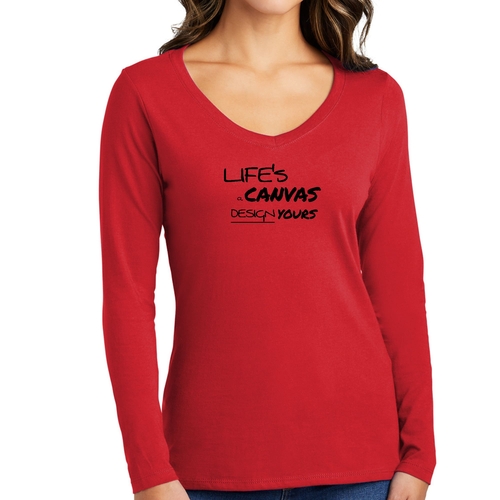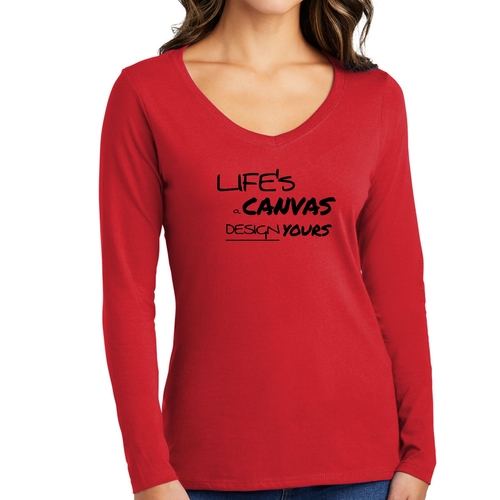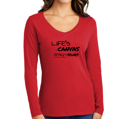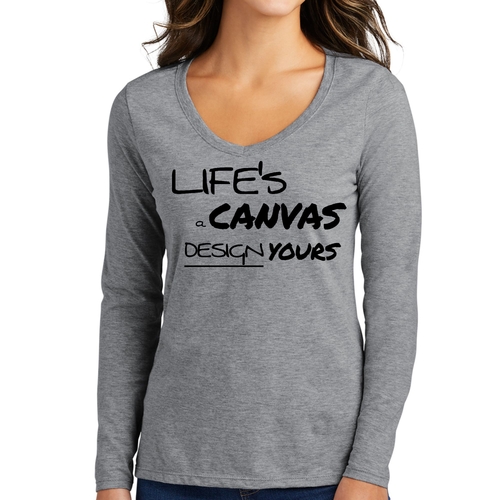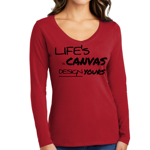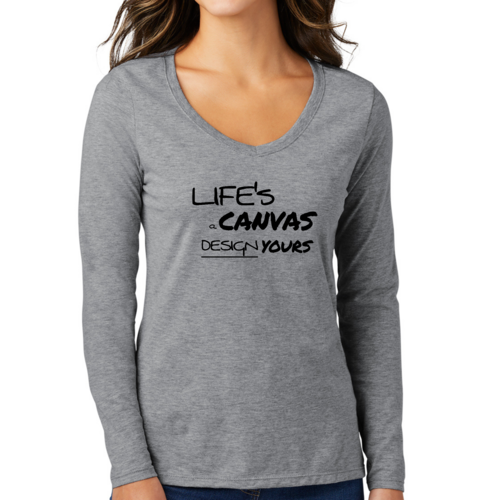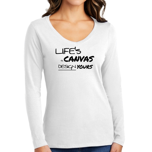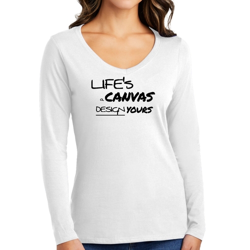 In summary, our Women's Long Sleeve V-neck Graphic T-shirt featuring the 'Life's a Canvas' design is a must-have for any fashion-forward woman. With its soft preshrunk cotton fabric, classic fit, and motivational graphic, this tee is sure to become a favorite in your wardrobe. Don't miss out on the opportunity to express your creativity and positivity through your clothing!