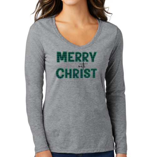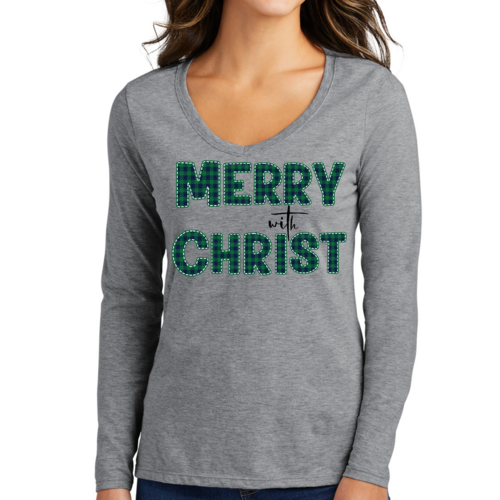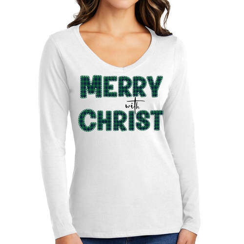 Introducing our Women's Long Sleeve V-neck Graphic T-shirt, featuring a festive 'Merry with Christ' design in a charming green plaid pattern. This T-shirt is not only a stylish addition to your holiday wardrobe but also offers exceptional comfort, making it perfect for any festive occasion. Crafted from soft, preshrunk cotton, this tee retains its softness and size even after multiple washes, ensuring that you can enjoy it for many seasons to come.