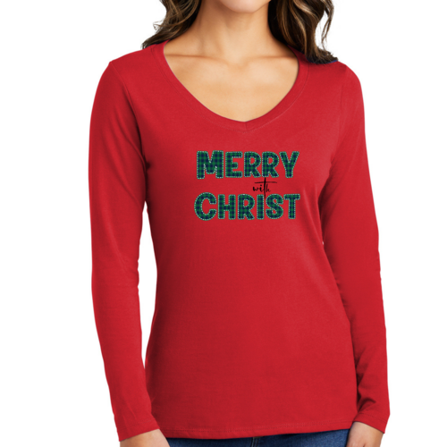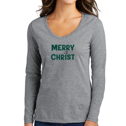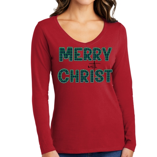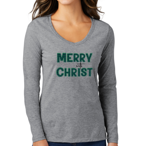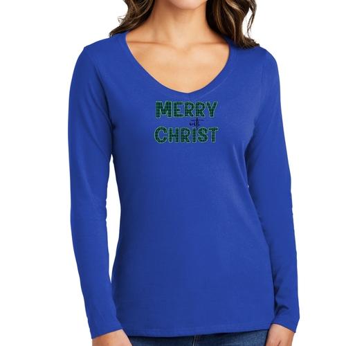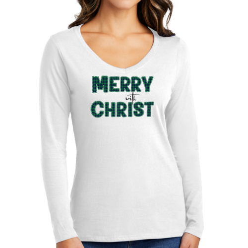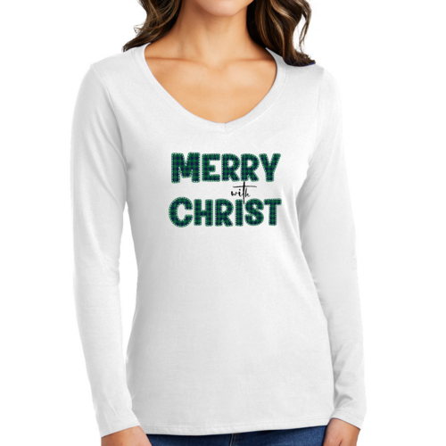 In summary, our Women's Long Sleeve V-neck Graphic T-shirt with the 'Merry with Christ' design is a must-have for anyone looking to celebrate the holiday season in style. With its comfortable fit, high-quality materials, and festive design, this T-shirt is sure to become a favorite in your wardrobe. Don't miss out on the opportunity to express your holiday spirit with this delightful graphic tee!