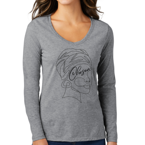 Introducing the Women's Long Sleeve V-neck Graphic T-shirt, Say It Soul, featuring the empowering 'Chosen' design. This unique t-shirt showcases beautiful black woman line art that celebrates self-worth and individuality. Made from soft, breathable cotton, this t-shirt is perfect for layering or wearing on its own, making it a versatile addition to your wardrobe.