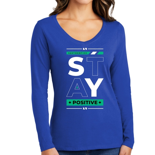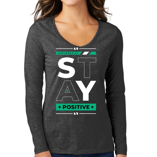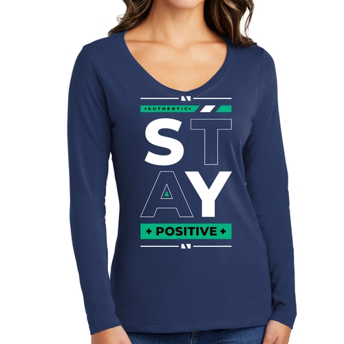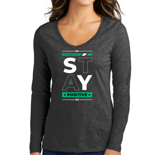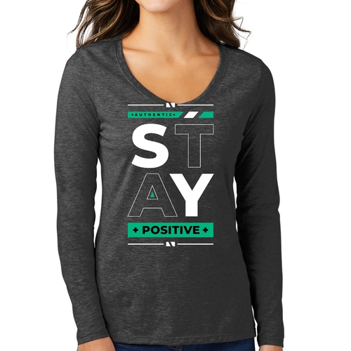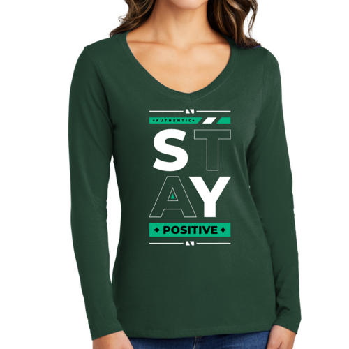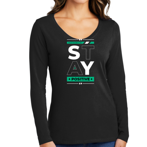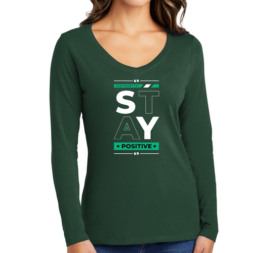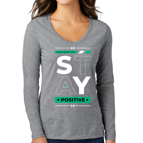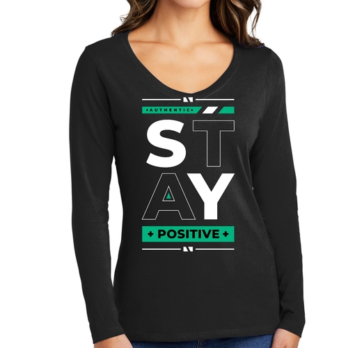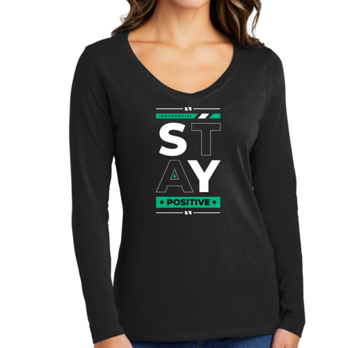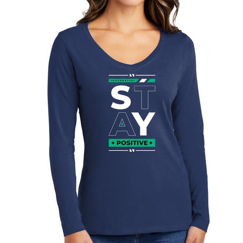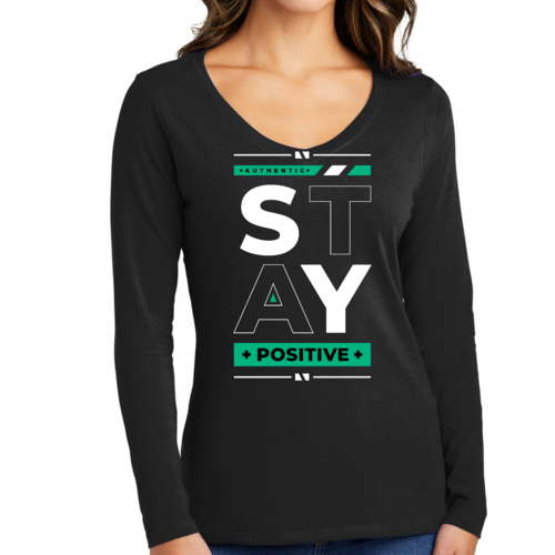 Women's Long Sleeve V-neck Graphic T-shirt with 'Stay Positive' print, showcasing a comfortable fit and stylish design.