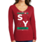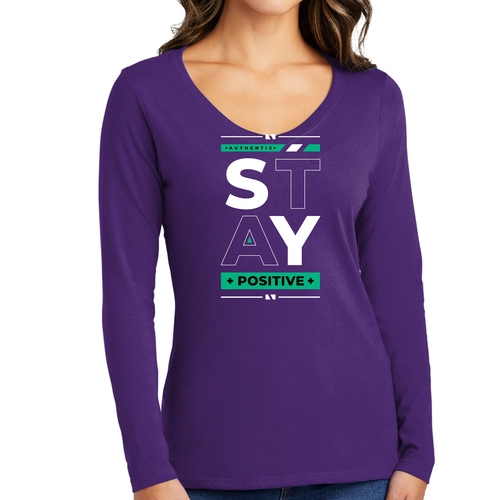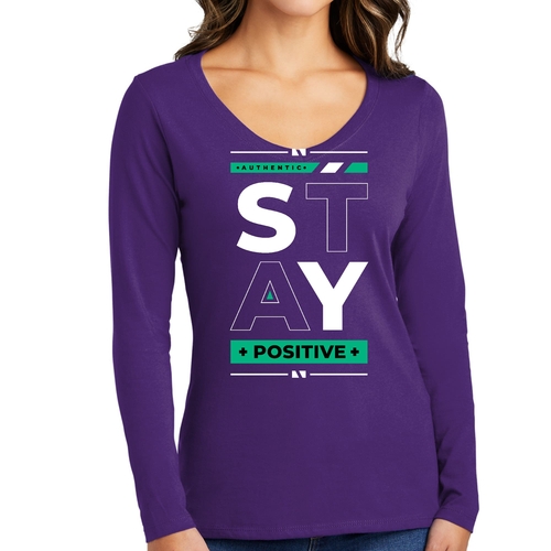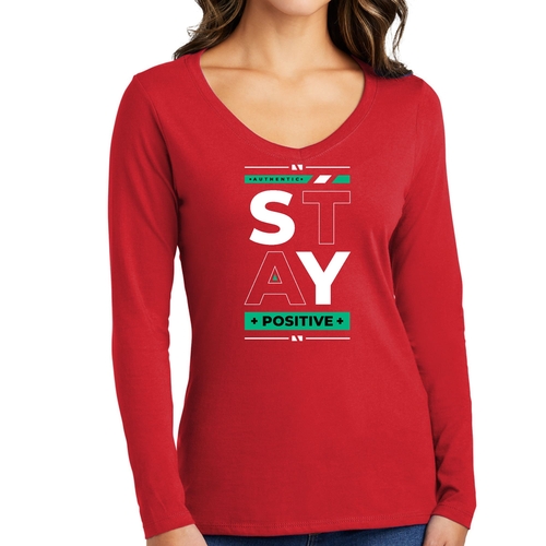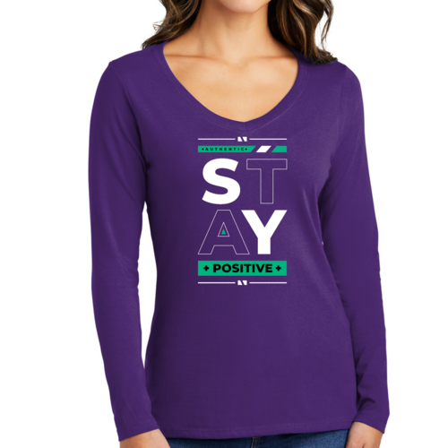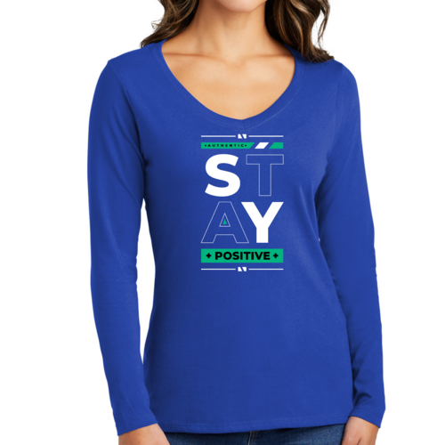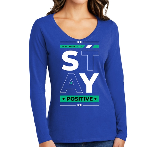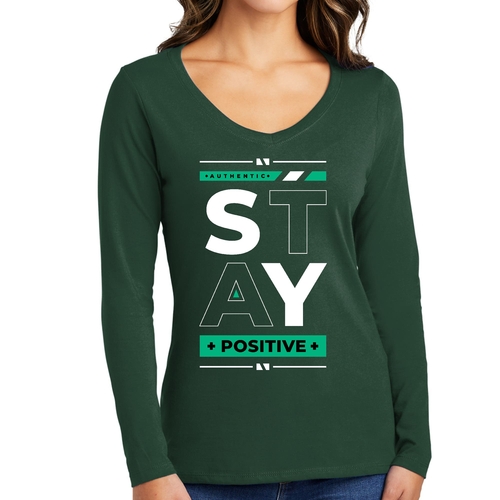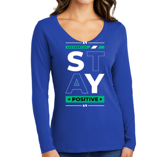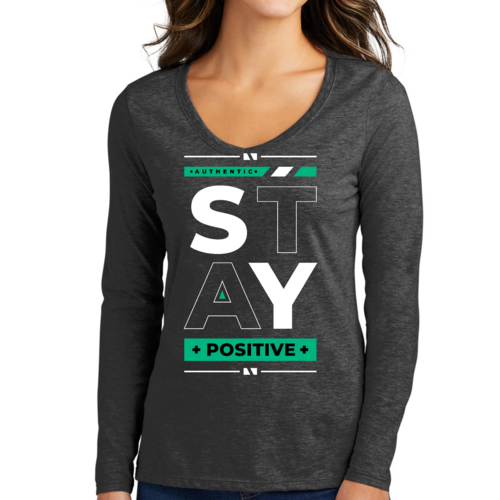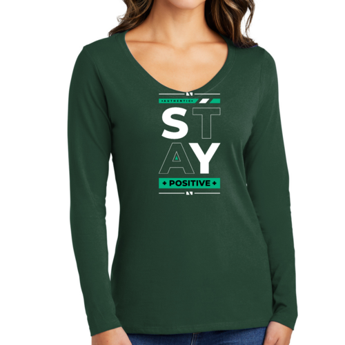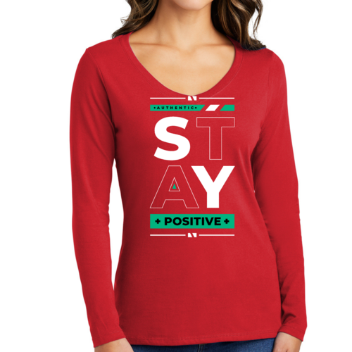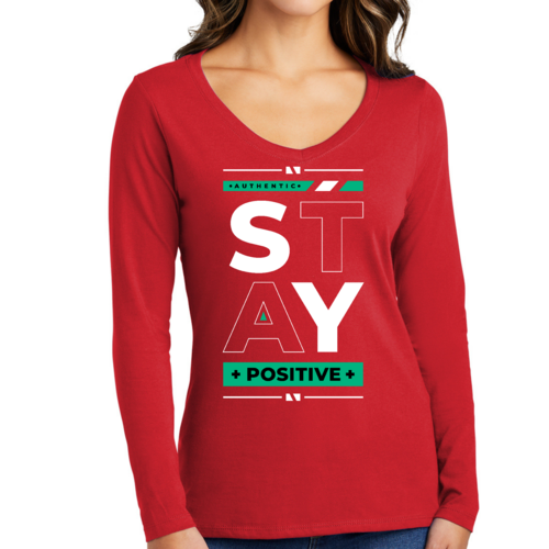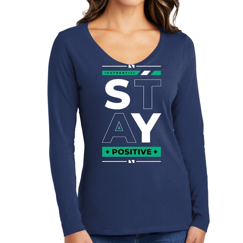 Women's Long Sleeve V-neck Graphic T-shirt with 'Stay Positive' print, showcasing a comfortable fit and stylish design.