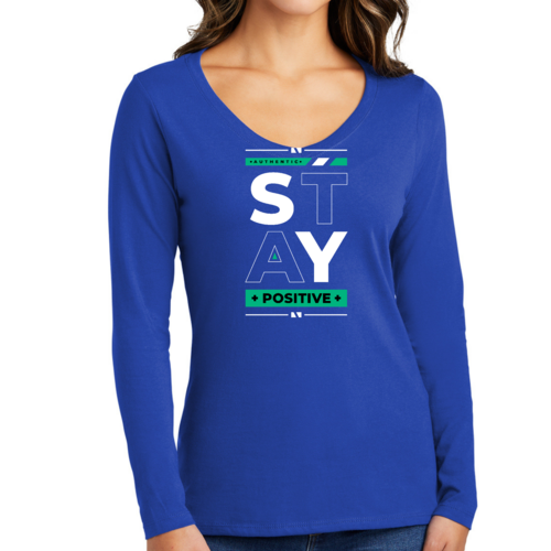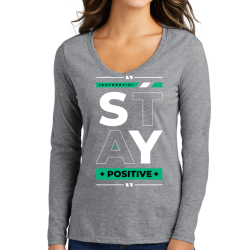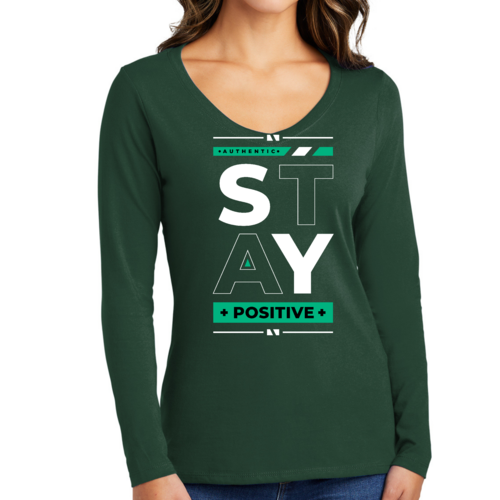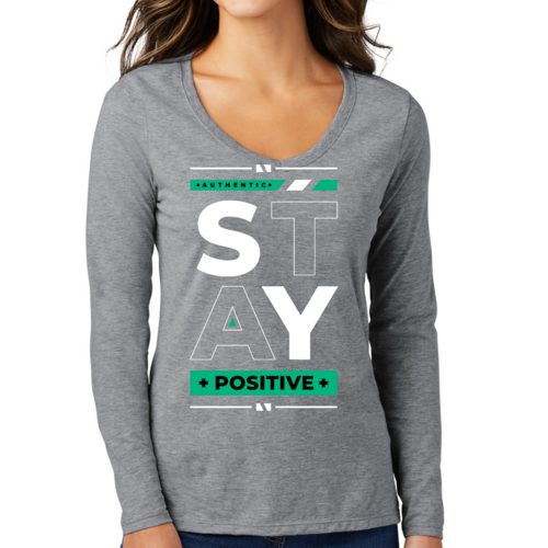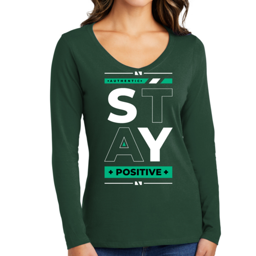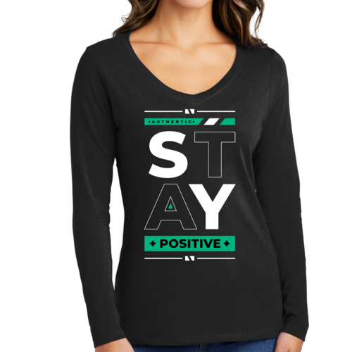 Introducing our Women's Long Sleeve V-neck Graphic T-shirt featuring the uplifting message 'Stay Positive'. This stylish and comfortable tee is designed for women who appreciate both fashion and motivation. Made from high-quality preshrunk cotton, this shirt ensures that you not only look good but also feel great throughout the day.