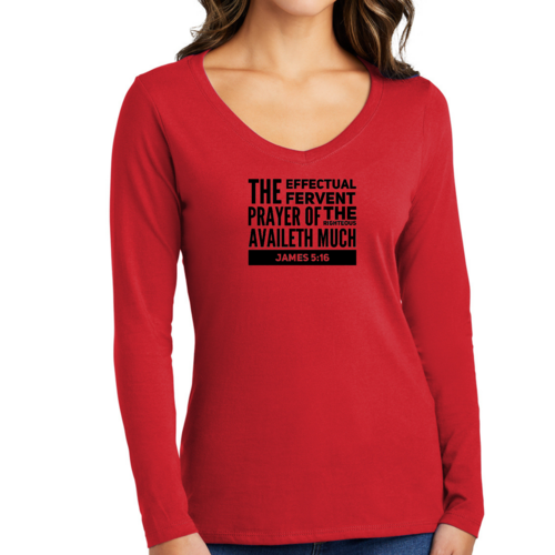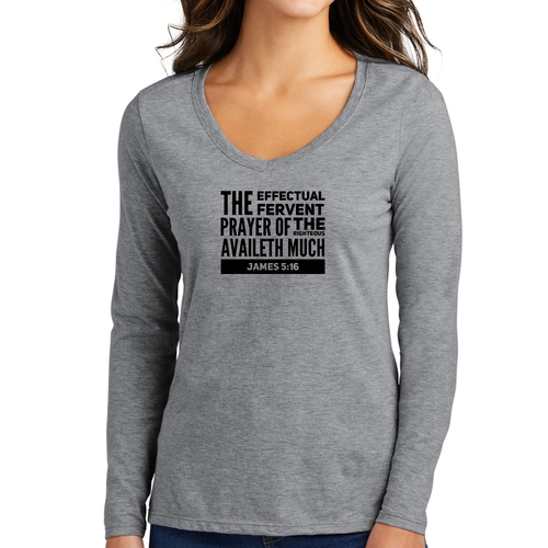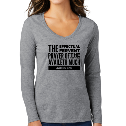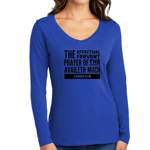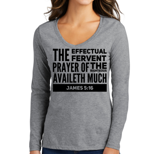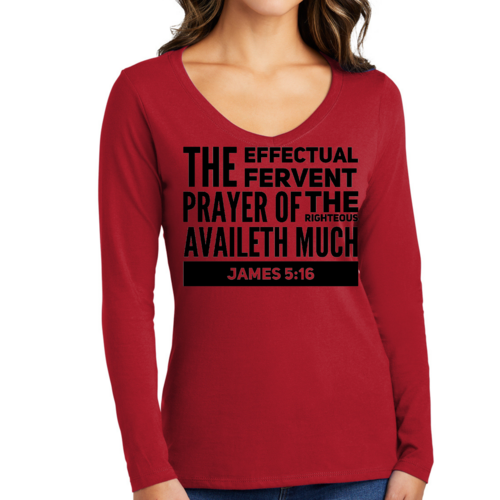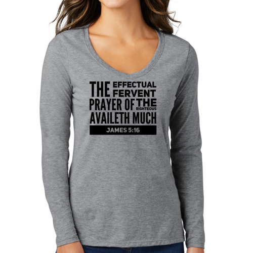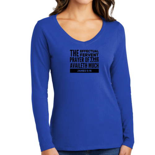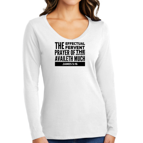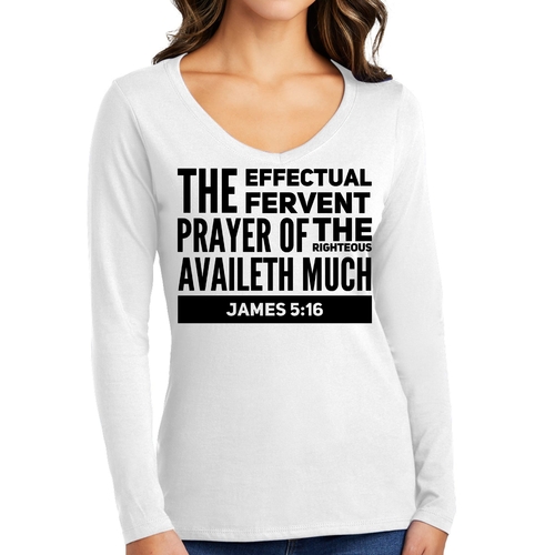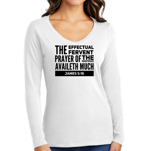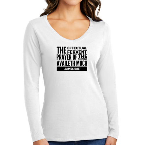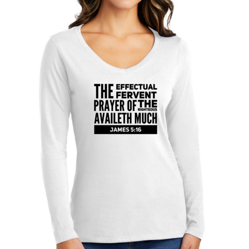 Introducing the Womens Long Sleeve V-neck Graphic T-shirt, a perfect blend of comfort and inspiration. This stylish tee features the powerful quote from James 5:16, 'The Effectual Fervent Prayer Of The Righteous Availeth Much.' Made from soft, preshrunk cotton, this shirt is designed to retain its softness and size even after multiple washes, ensuring you enjoy its comfort for years to come.