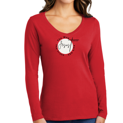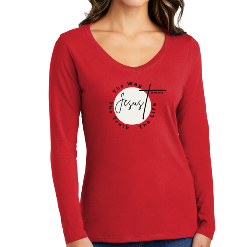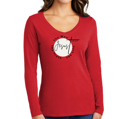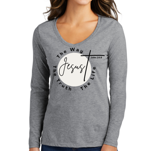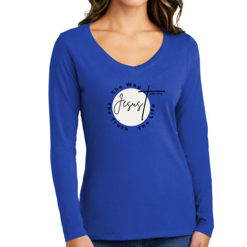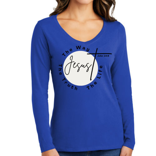 Introducing our Women's Long Sleeve V-neck Graphic T-shirt, featuring the powerful message 'The Truth The Way The Life.' This stylish and comfortable tee is perfect for those who want to express their faith while enjoying a relaxed fit. Made from high-quality preshrunk cotton, this shirt retains its softness and size even after multiple washes, ensuring that it remains a staple in your wardrobe for years to come.