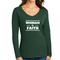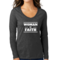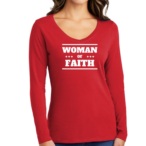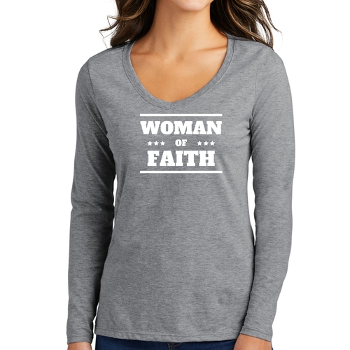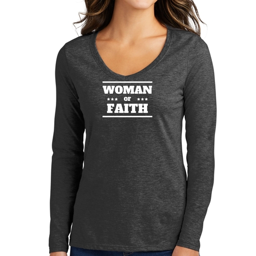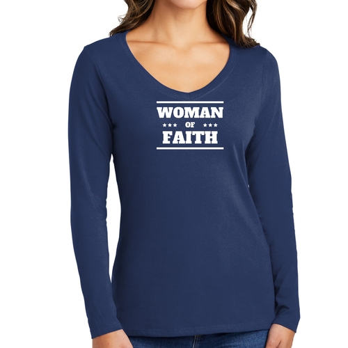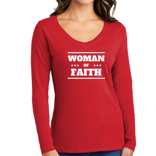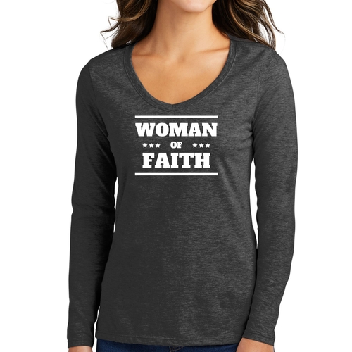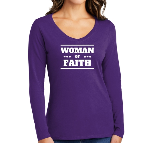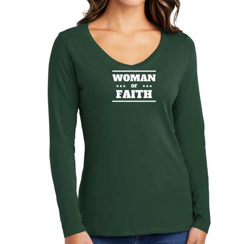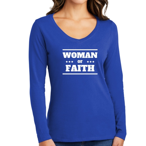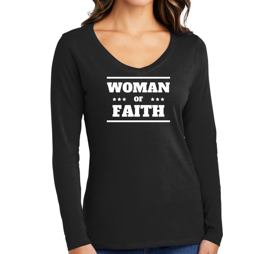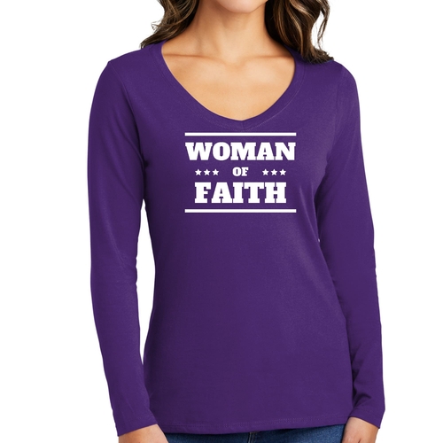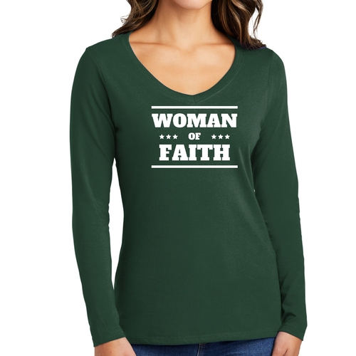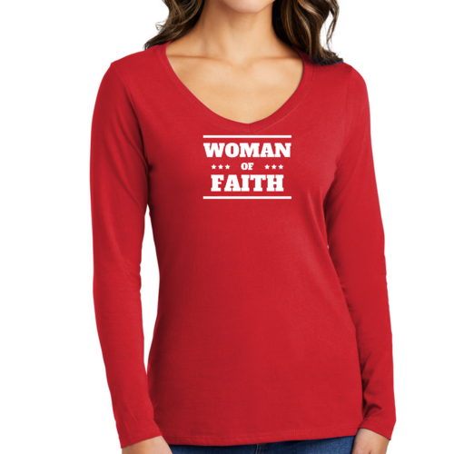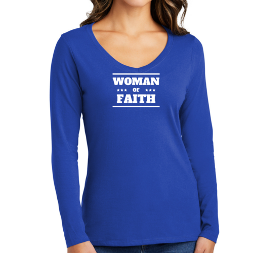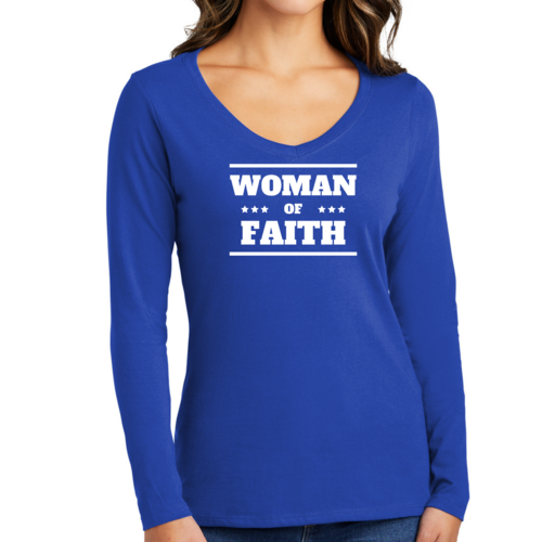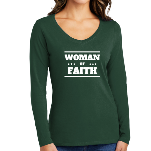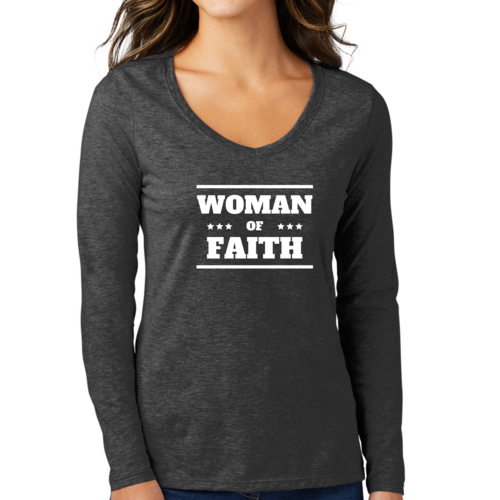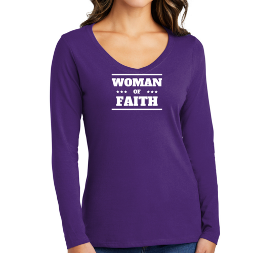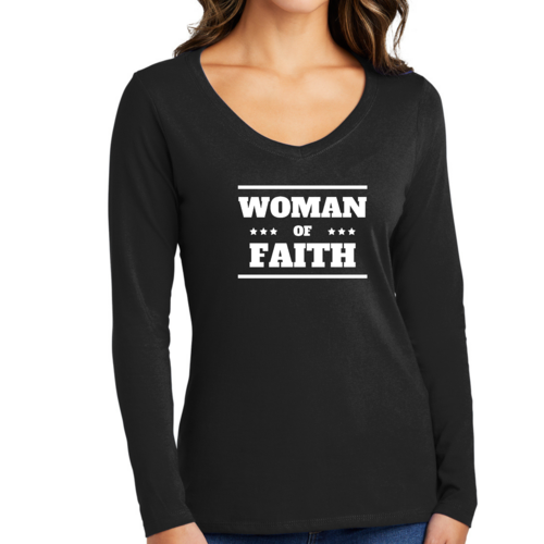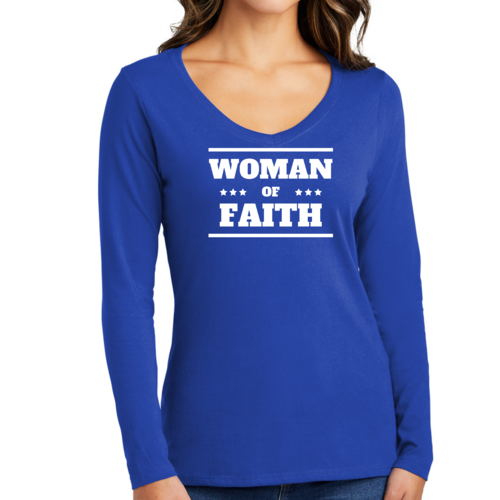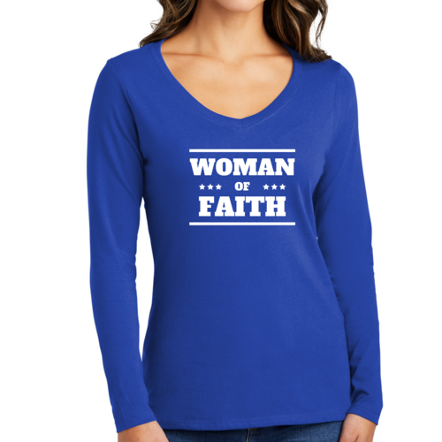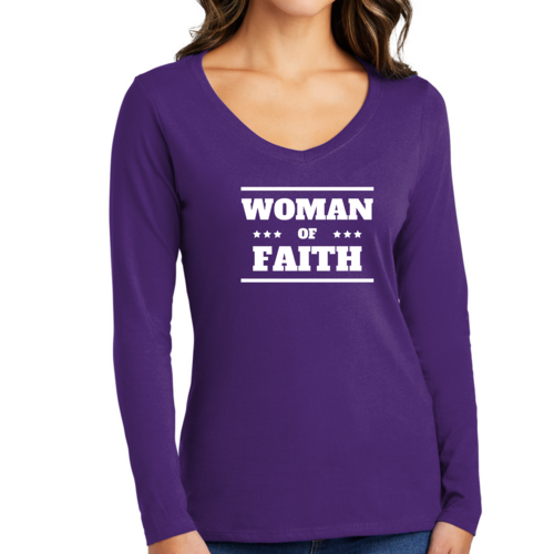 Introducing the Women's Long Sleeve V-neck Graphic T-shirt, a perfect blend of comfort and inspiration. This tee features the empowering message 'Woman of Faith,' making it an ideal choice for those who want to express their beliefs through fashion. Crafted from soft, preshrunk cotton, this shirt ensures that you not only look good but feel great too.