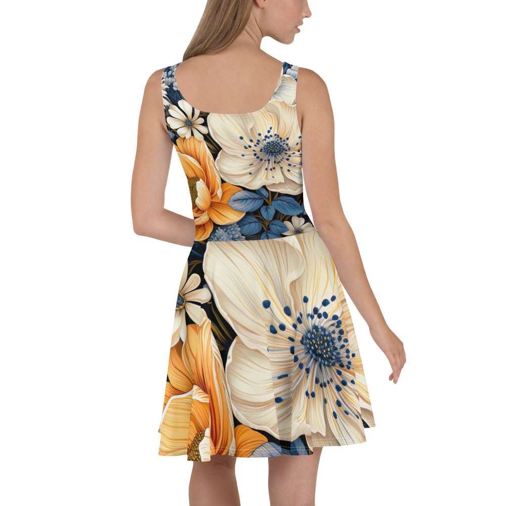 Introducing our stunning Women's Skater Dress in a beautiful floral blue print, designed to make you feel confident and stylish for any occasion. This dress features a flattering A-line silhouette that cinches at the waist and flares out, creating a feminine and playful look that is perfect for summer outings, garden parties, or casual get-togethers with friends.