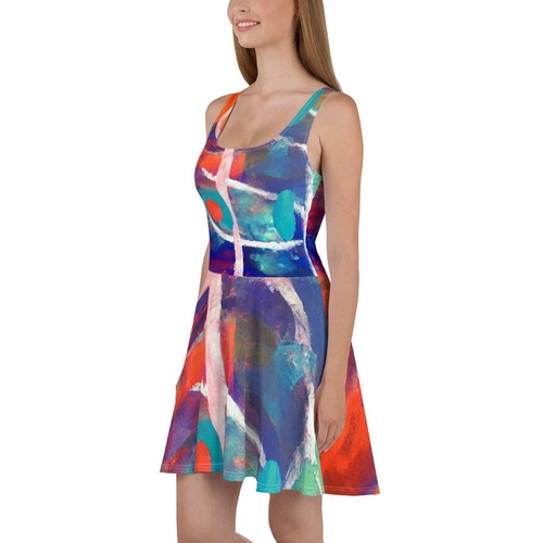 Introducing our stunning Women's Skater Dress, featuring a vibrant red and blue multicolor abstract print that is sure to turn heads. This dress is designed for the modern woman who values both style and comfort. The flattering A-line silhouette cinches at the waist and flares out, creating a feminine and playful look that is perfect for any occasion.