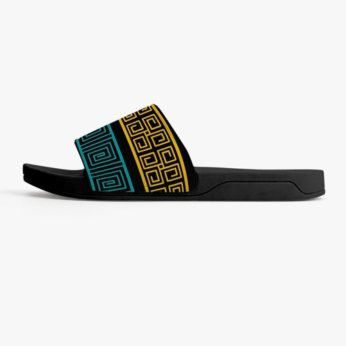 Introducing our Women's Slide Sandals in a vibrant blue and yellow geometric print, designed to elevate your casual wardrobe. These sandals are not just a footwear choice; they are a statement piece that complements any outfit. Whether you're heading to the beach, running errands, or enjoying a casual day out, these sandals provide the perfect blend of style and comfort.
