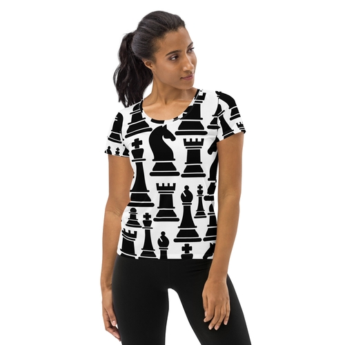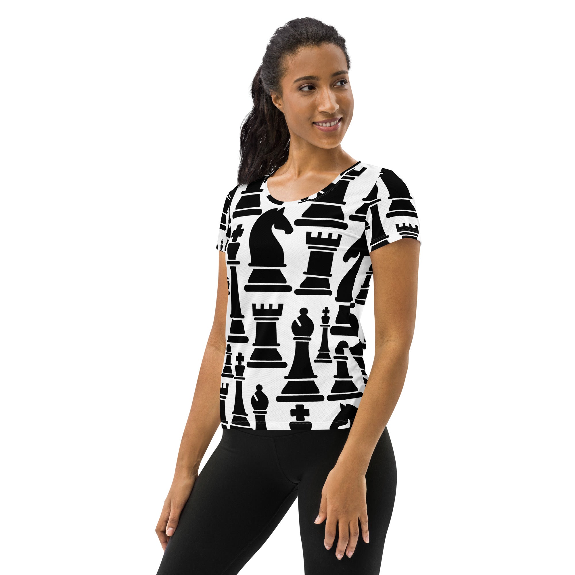 Introducing our Women's Stretch Fit Athletic Sports T-shirt in a striking black and white chess print, designed to enhance your performance and comfort during any workout. This t-shirt is not just a piece of clothing; it's a carefully engineered garment that combines style with functionality. Made from a premium blend of 92% polyester and 8% spandex, it offers a form-fitting yet flexible fit that moves seamlessly with your body, allowing for unrestricted movement.