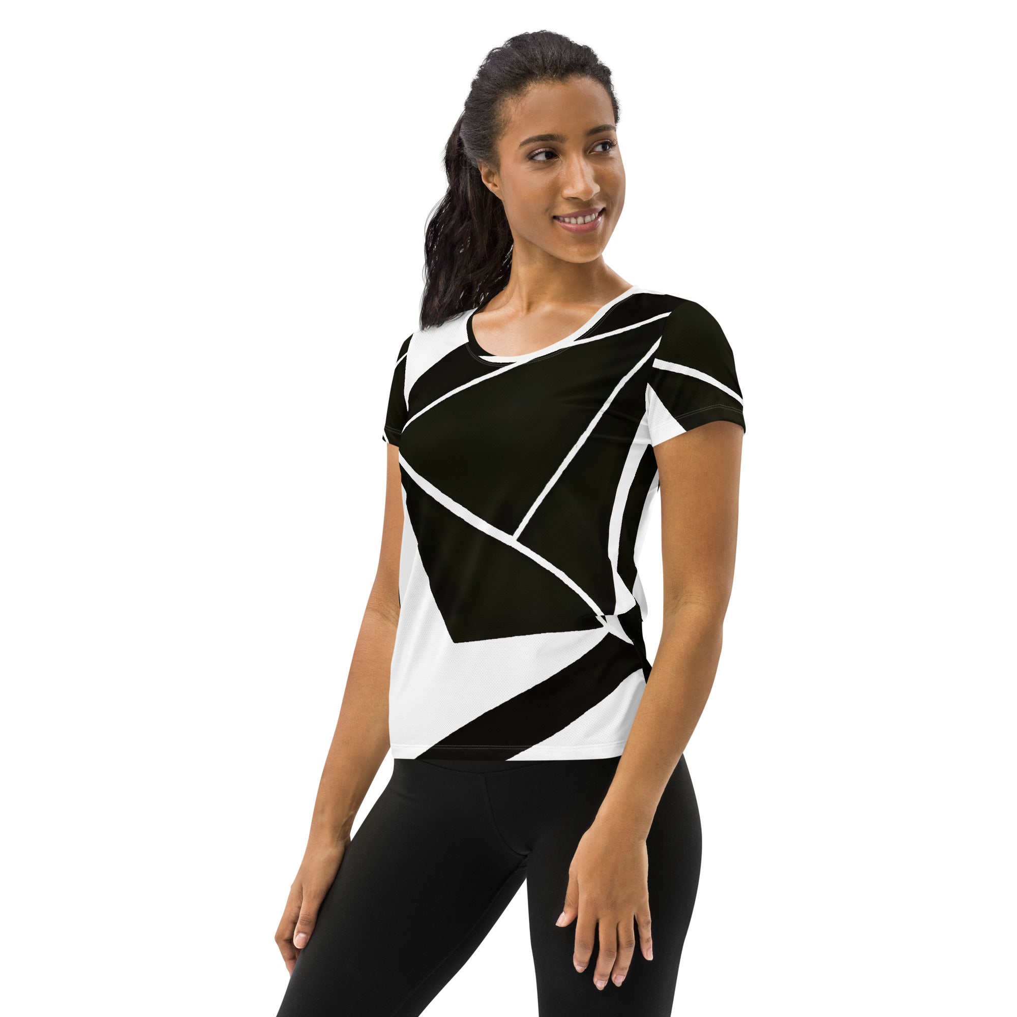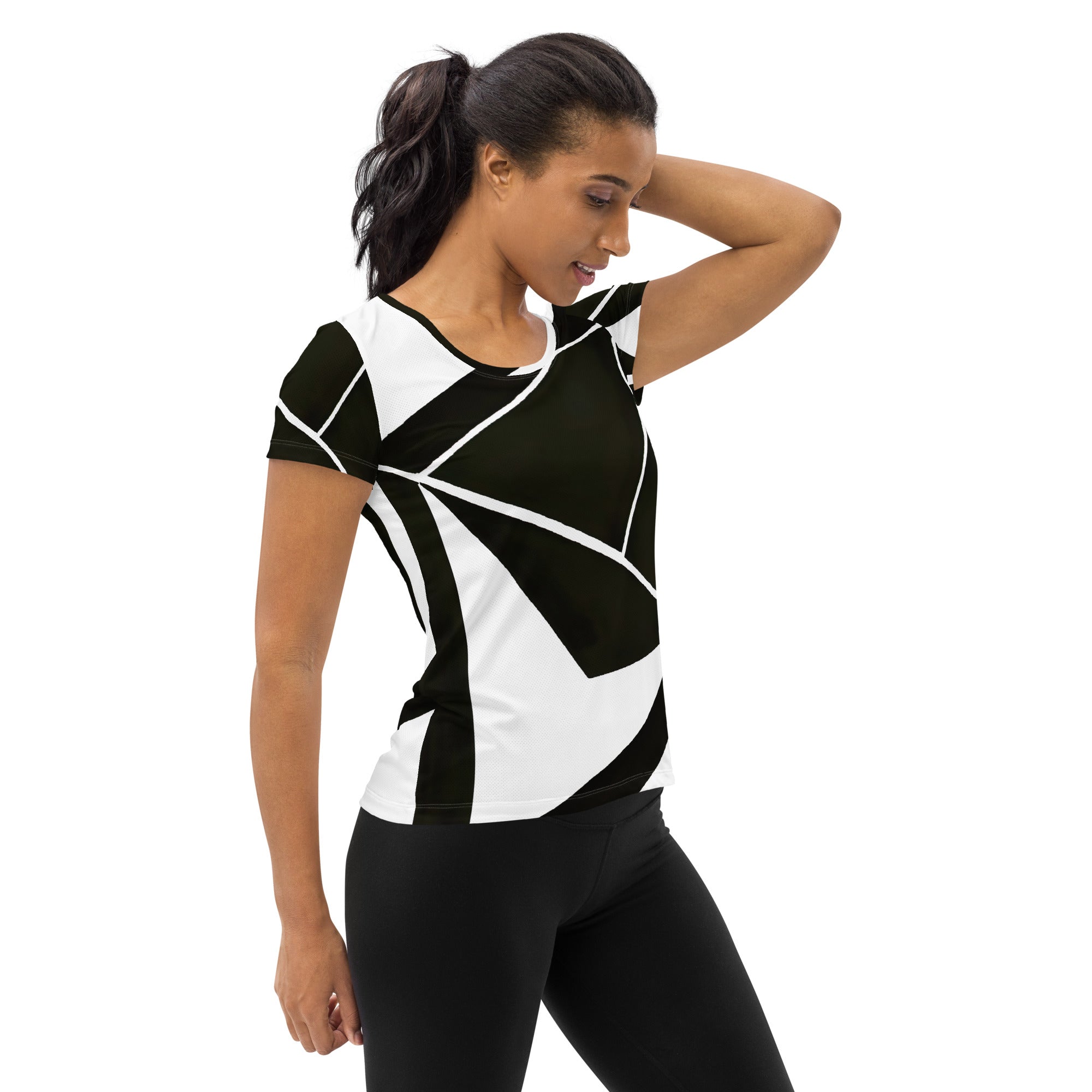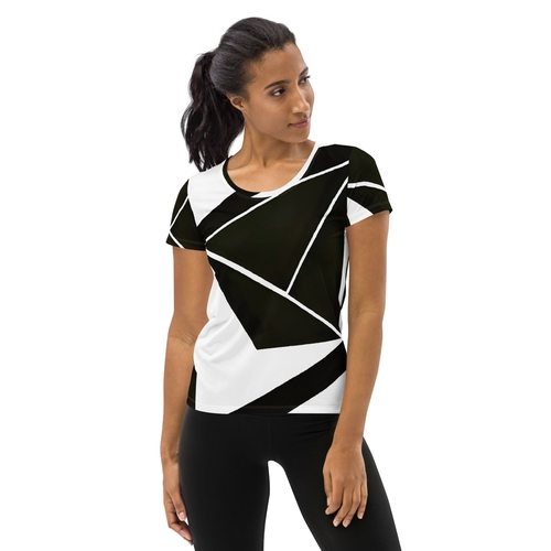 Introducing our Women's Stretch Fit Athletic Sports T-shirt, designed specifically for active women who value both performance and style. This t-shirt features a striking black and white geometric pattern that not only looks great but also enhances your workout experience. Crafted from a premium blend of 92% polyester and 8% spandex, this t-shirt is engineered to provide a form-fitting yet flexible fit that moves seamlessly with your body.