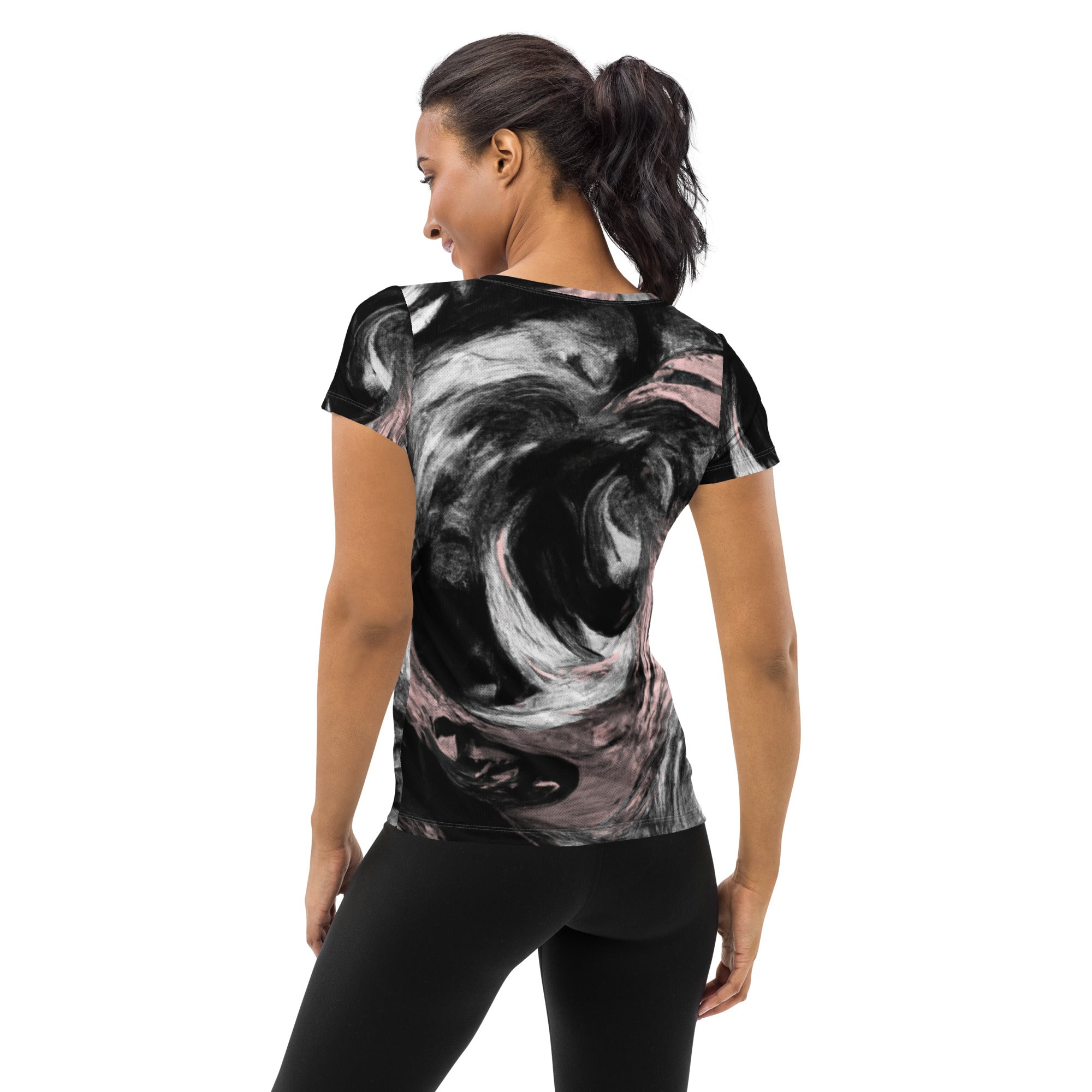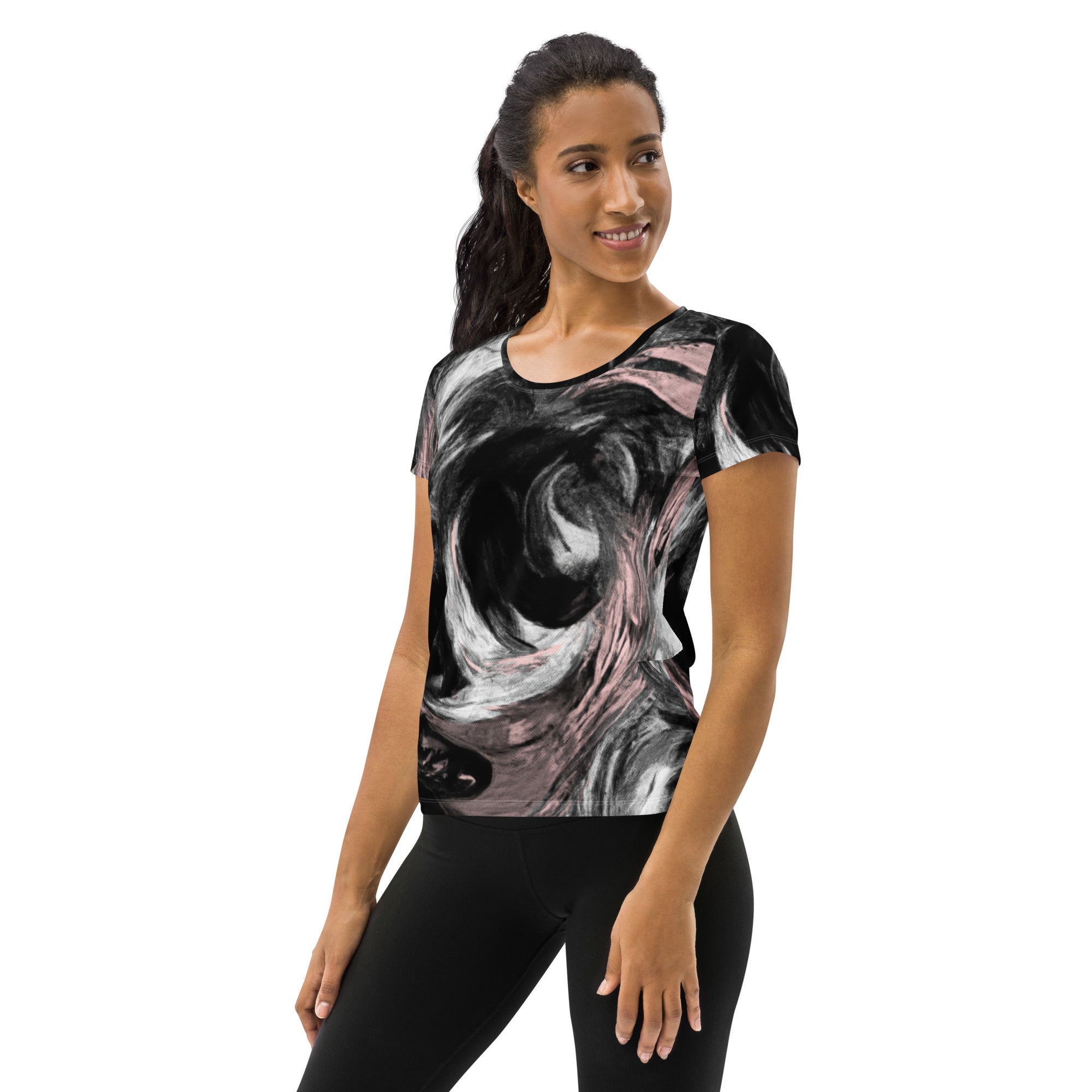 This t-shirt is designed with an athletic silhouette, featuring a classic crew neckline and short sleeves that provide a timeless look suitable for any activity. Whether you're hitting the gym, going for a run, or participating in sports, this t-shirt is your ultimate choice for optimal performance and style. The black, pink, and white abstract pattern adds a touch of flair, making it easy to pair with your favorite leggings or shorts.