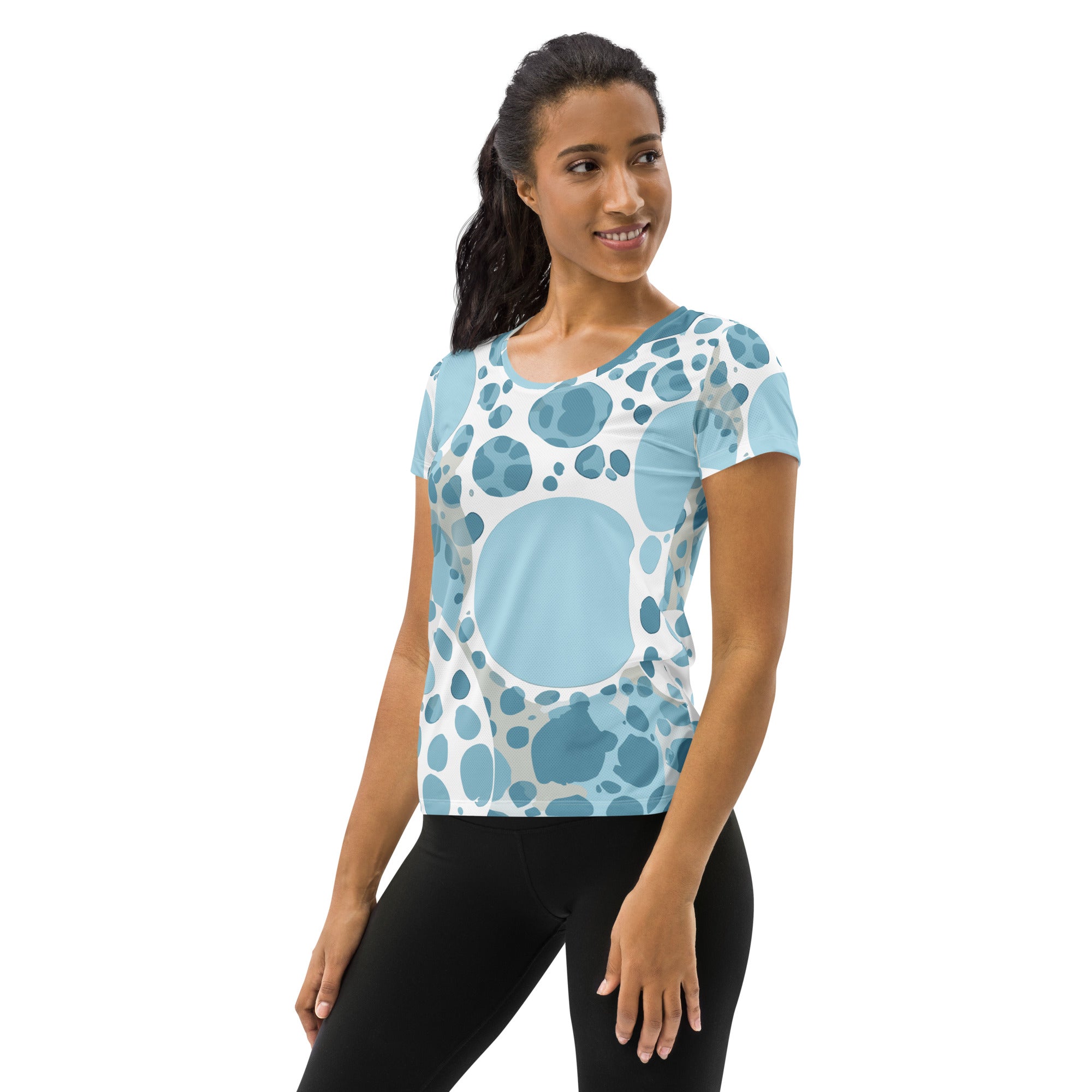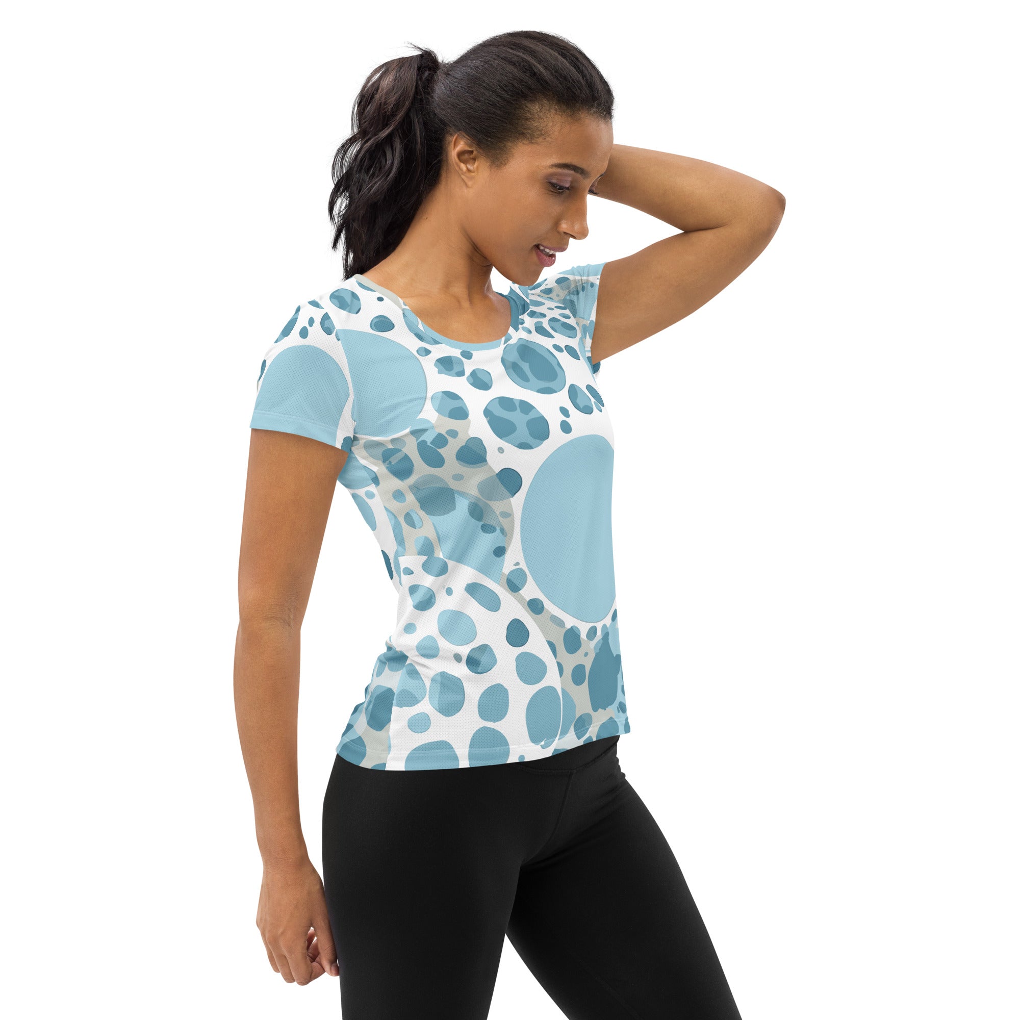 This t-shirt features a classic athletic silhouette with a crew neckline and short sleeves, offering a versatile look that can be worn for various activities. The blue and white circular spotted illustration adds a touch of style, making it suitable for both workouts and casual outings. Pair it with your favorite leggings or shorts for a complete athletic look.