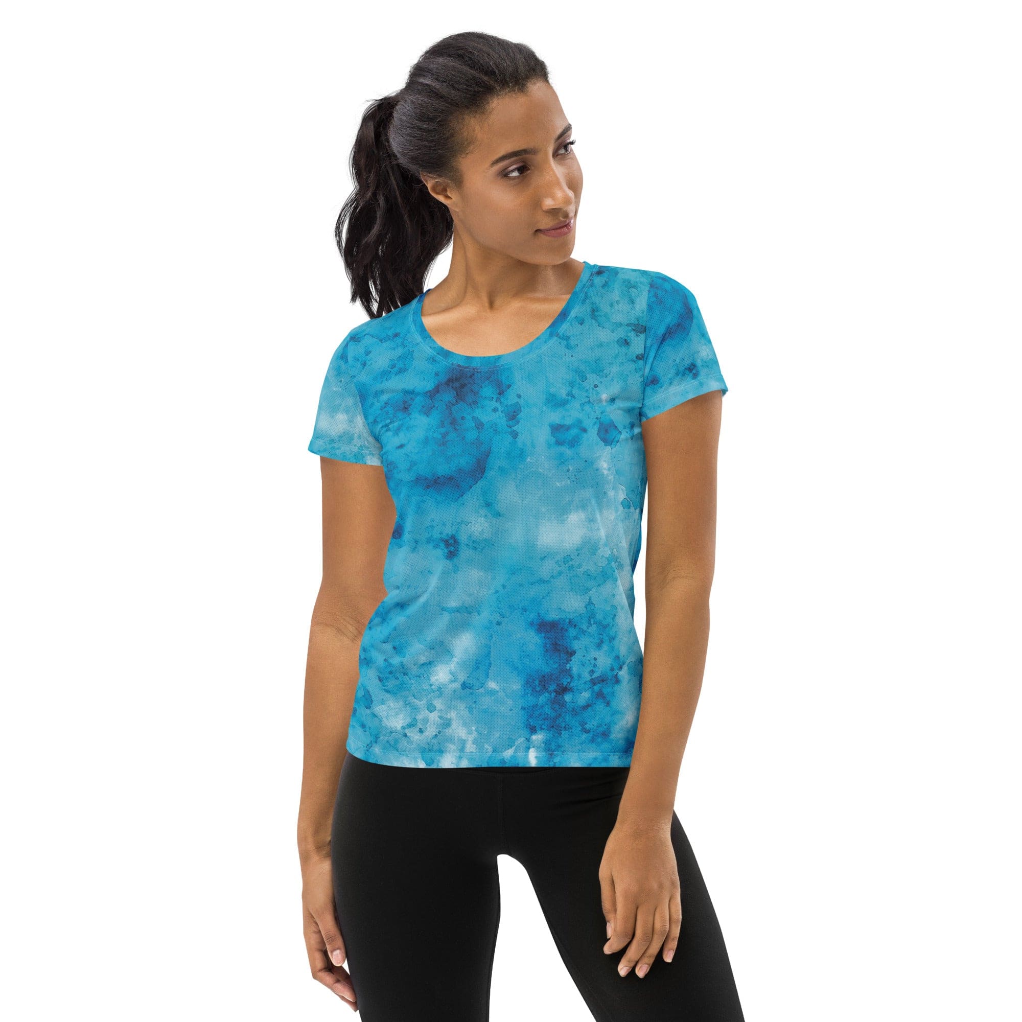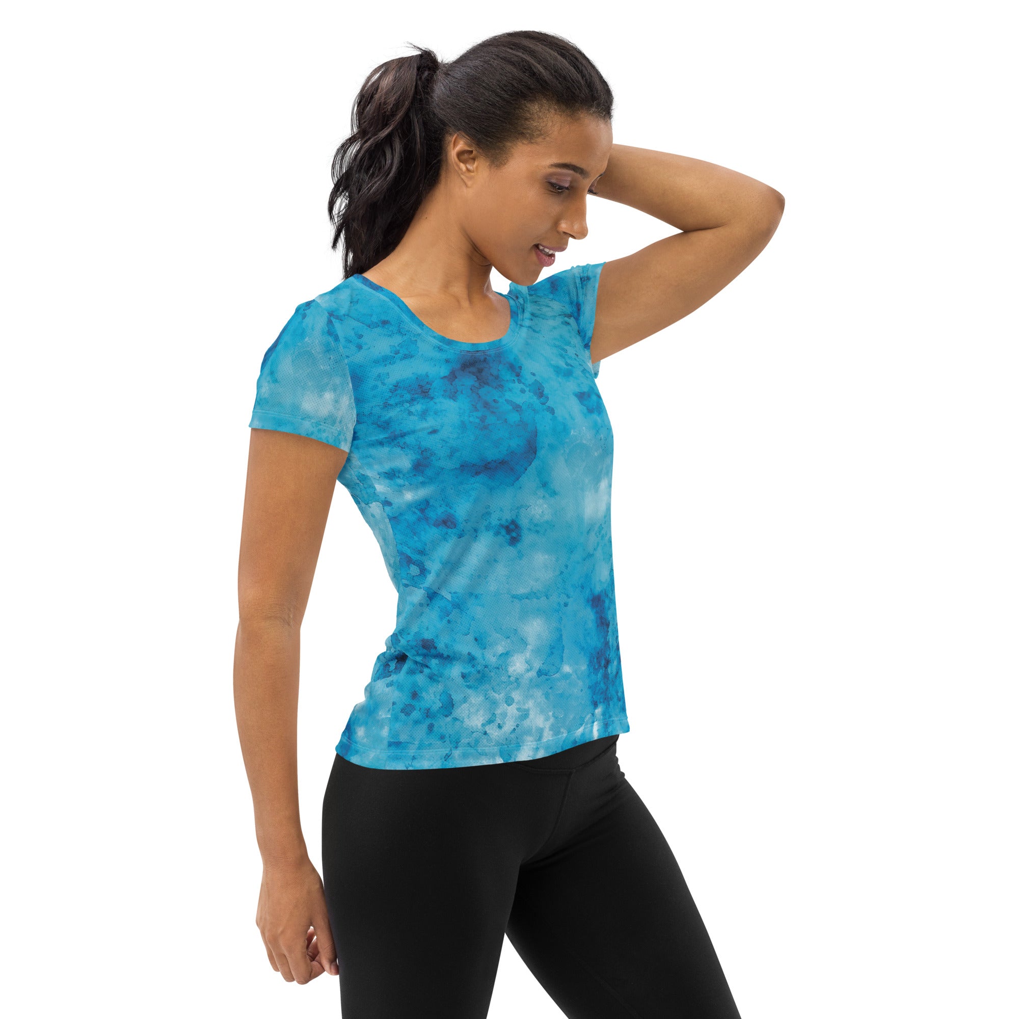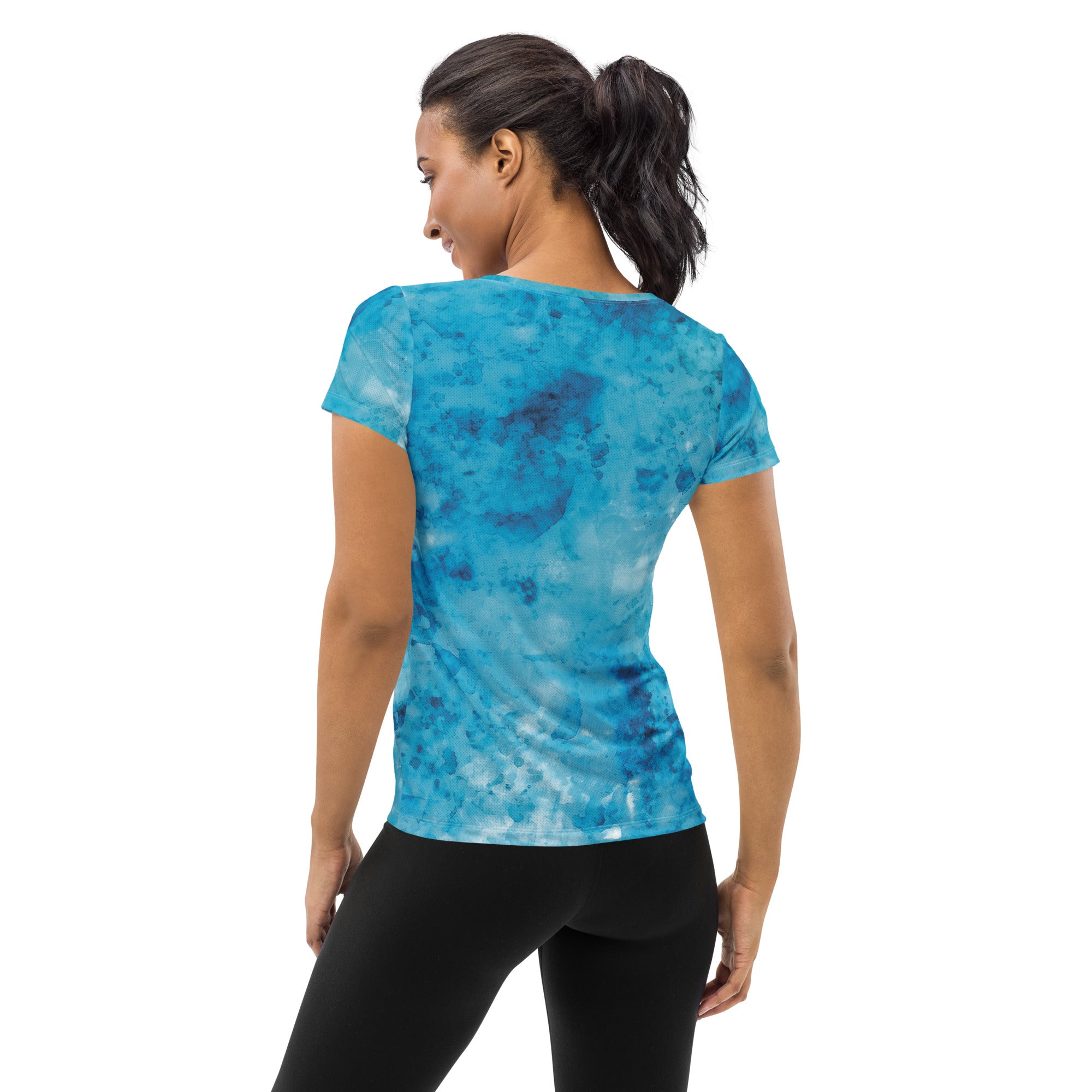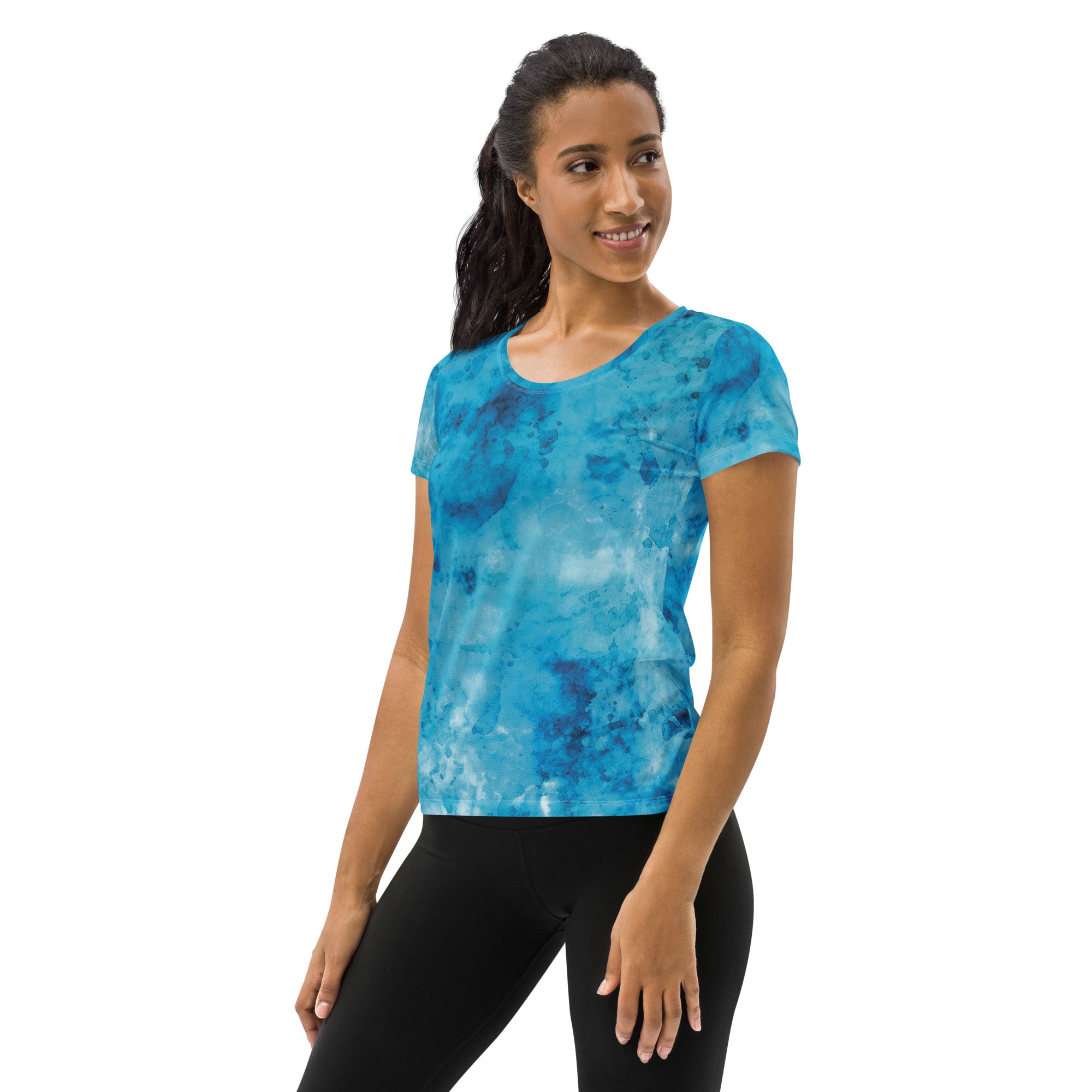 In summary, the Women's Stretch Fit Athletic Sports T-shirt in blue marble print is the perfect blend of performance and style. Whether you're hitting the gym, going for a run, or enjoying a casual day out, this t-shirt will keep you looking and feeling great. Don't miss out on adding this versatile piece to your athletic wardrobe!