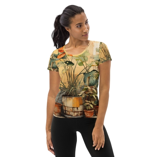 With its athletic silhouette, this t-shirt features a classic crew neckline and short sleeves, making it a versatile choice for any activity. The earthy rustic potted plants print not only adds a unique flair but also allows you to express your personal style while you work out. Pair it with your favorite leggings or shorts for a complete athletic look that transitions effortlessly from the gym to casual outings.
