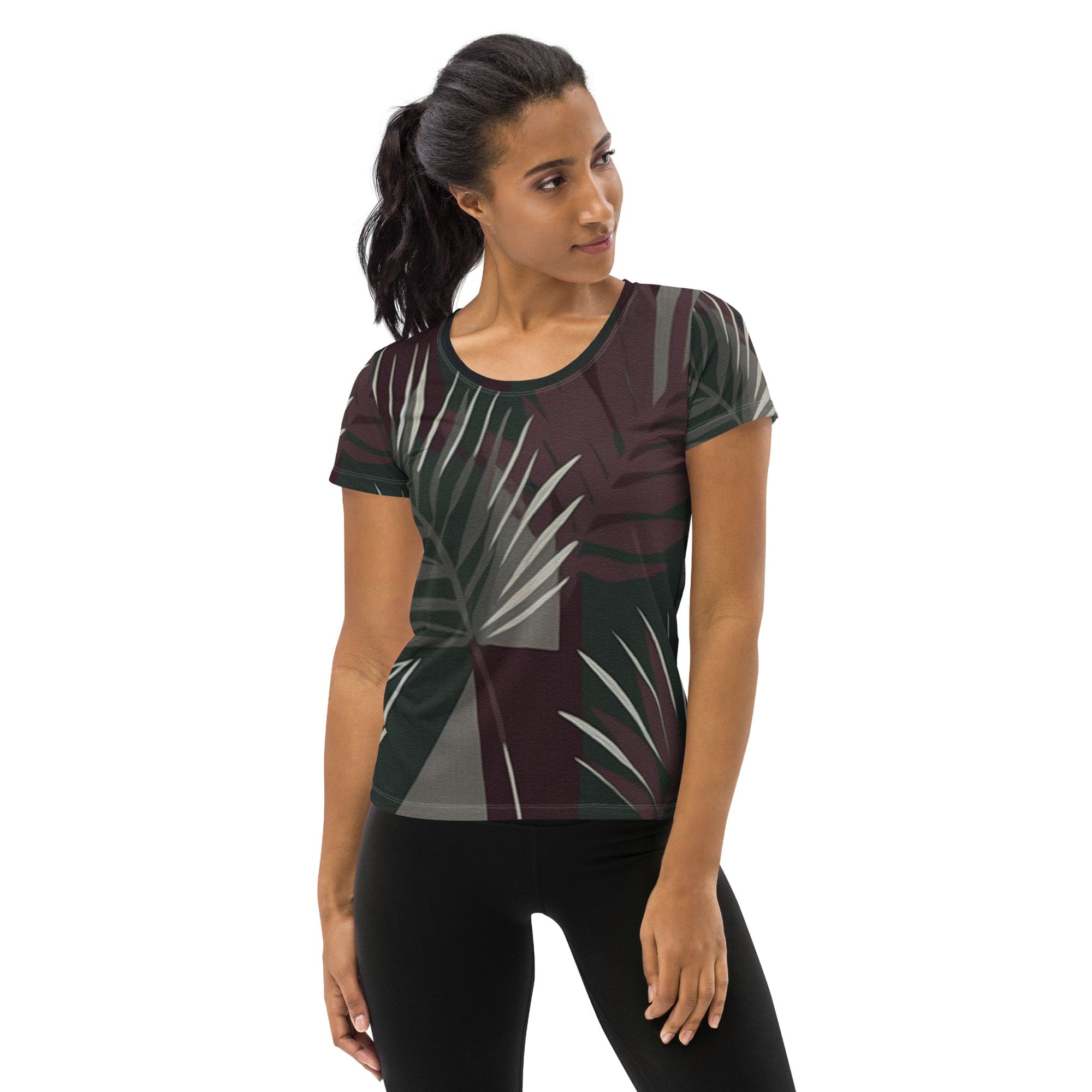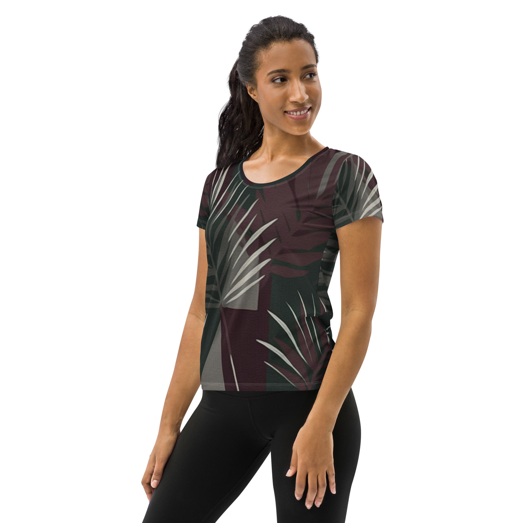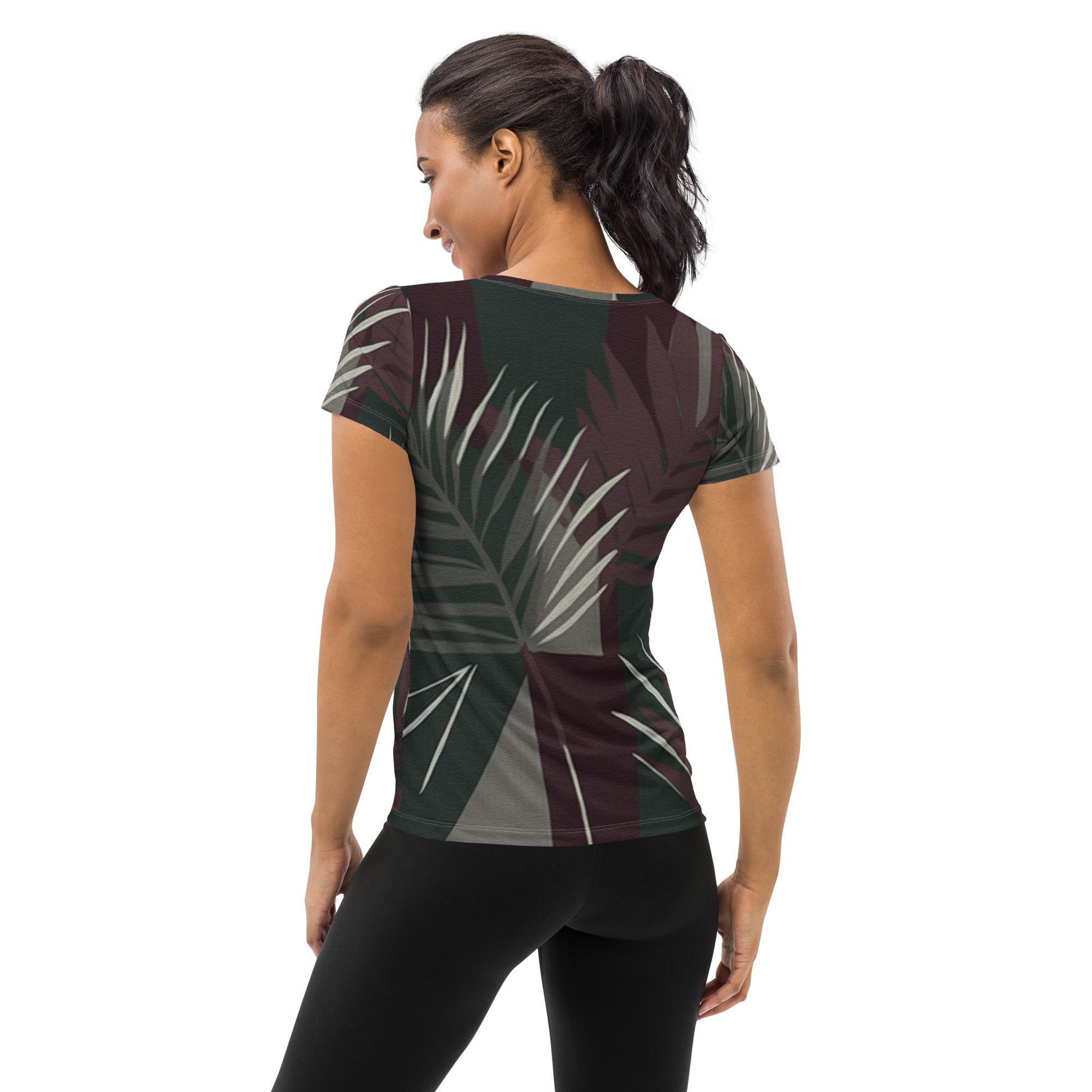 Introducing our Women's Stretch Fit Athletic Sports T-shirt, designed specifically for active women who value both performance and style. This t-shirt features a stunning palm tree leaves design set against a maroon background, making it not only functional but also fashionable. Crafted from a premium blend of 92% polyester and 8% spandex, this t-shirt offers a perfect balance of stretch and support, ensuring that you can move freely during any workout.