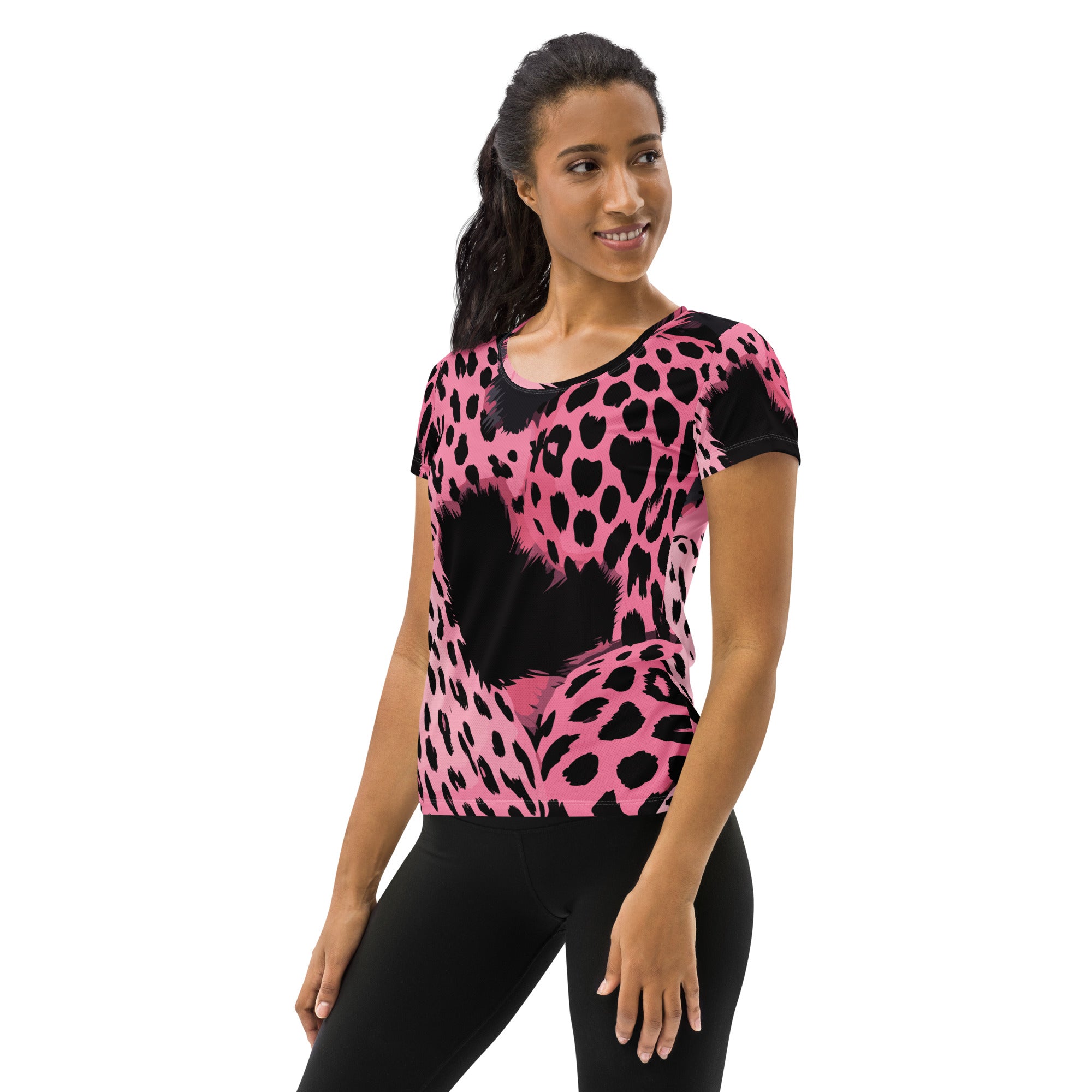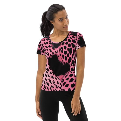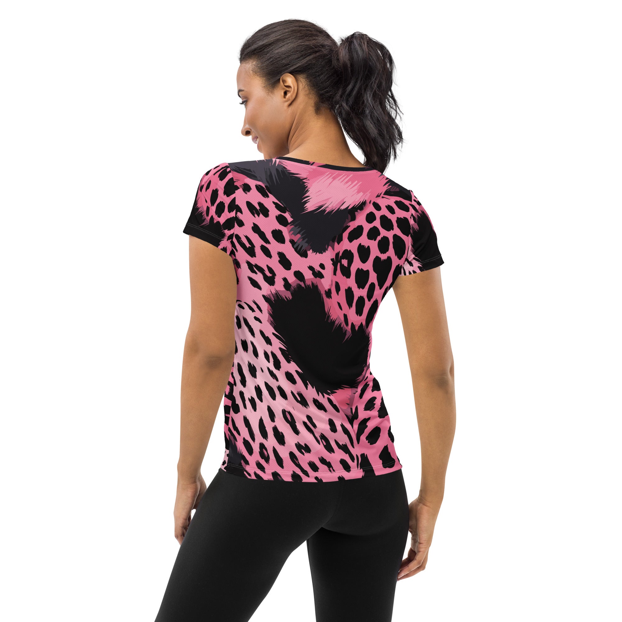 With its athletic silhouette, this t-shirt features a classic crew neckline and short sleeves, making it a versatile addition to your workout wardrobe. The stylish pink and black spotted print adds a touch of flair, allowing you to express your personality while staying active. Pair it with your favorite leggings or shorts for a complete workout look that transitions effortlessly from the gym to casual outings.