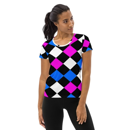 Introducing our Women's Stretch Fit Athletic Sports T-shirt in a vibrant pink blue checkered pattern, designed specifically for active women who value both style and performance. This t-shirt is crafted from a premium blend of 92% polyester and 8% spandex, ensuring a comfortable and flexible fit that moves with you during any workout. Whether you're lifting weights, running, or participating in team sports, this t-shirt is engineered to enhance your performance while keeping you looking great.